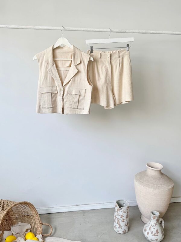 $20,500Descripción: chaleco de escote pico y manga sisa. Detalles de bolsillo en delantero. Cierre frontal con botones. Tiras decorativas en espalda.
