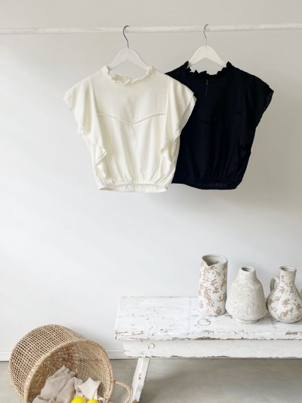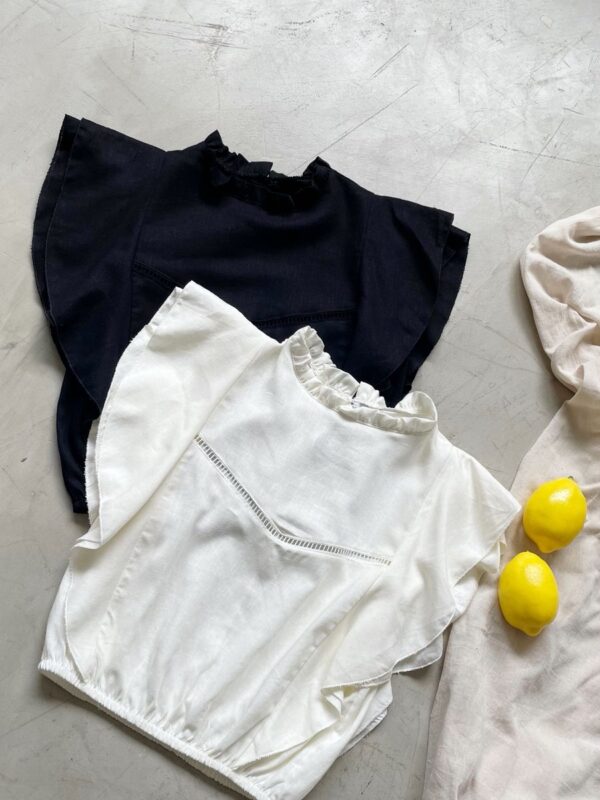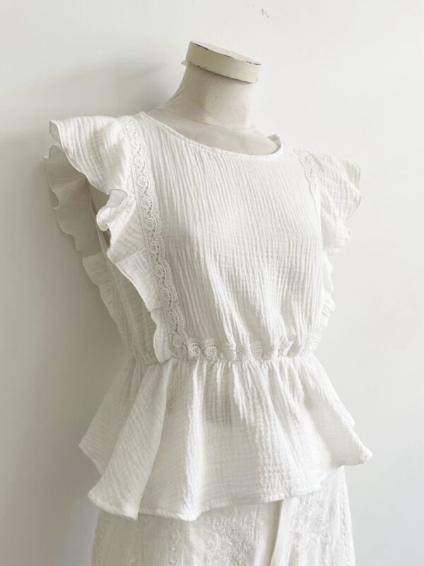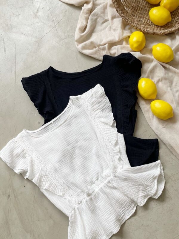 $14,500Descripción: blusa de cuello redondo. Detalle de volados y puntilla. Bajo acabado en elástico.