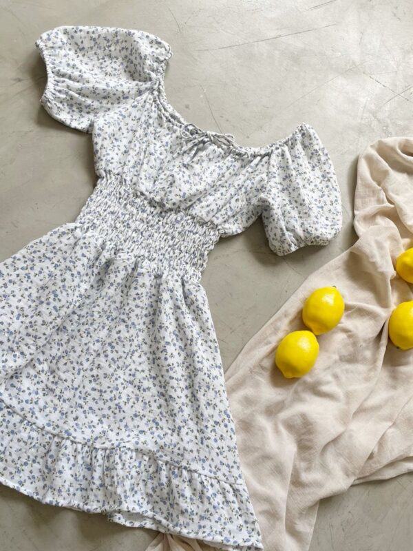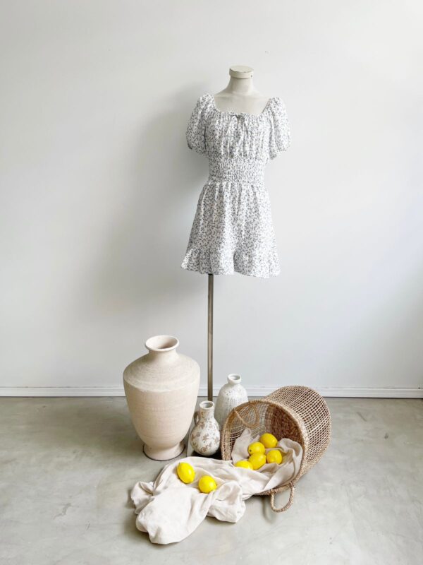 $21,500Descripción: Vestido estampado de escote recto ajustable. Manga corta abullonada. Cintura elástica. Detalle de volado en bajo.