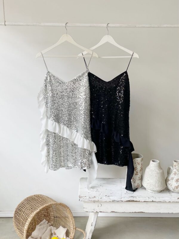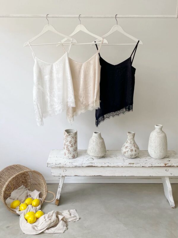 $16,500Descripción: músculosa lencera estampada de escote pico y tirantes finos. Detalle de aplicación de puntilla a tono. Bajo asimétrico.