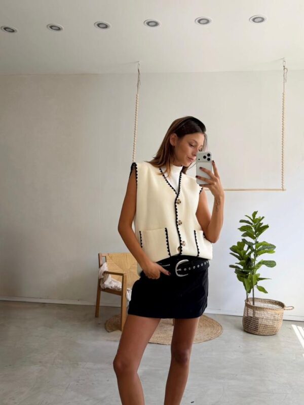 $33,000Descripción: Chaleco de escote v con manga sisa. Botones en delantero.