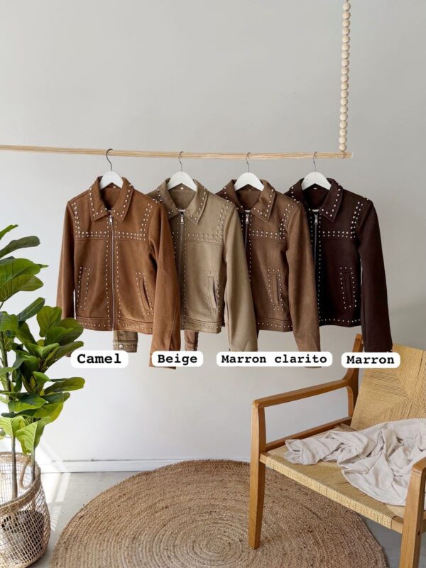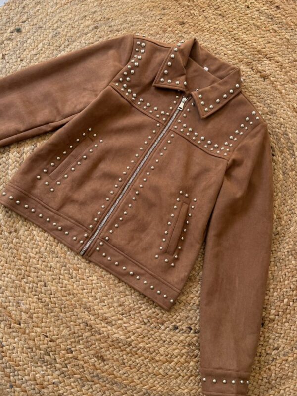 $68,000Descripción: Chaqueta corta de cuello solapa. Cierre frontal con cremallera metálica y botones decorativos. Bolsillos delanteros. Detalles de flecos y tachas en mangas y trasero.