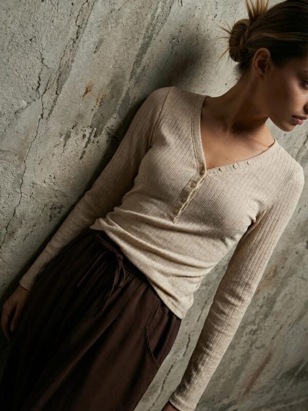 Cuidados: Lavar con agua fría y jabón neutro ayudará a mantener el color, la forma y estructura del textil.La modelo usa un talle 1 en color marron clarito.