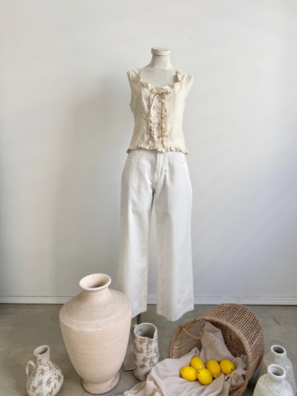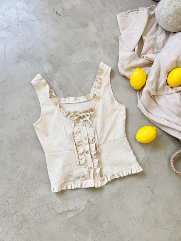 Descripción: Musculosa de escote recto. Forro interior en busto combinado a tono. Moño delantero decorativo. Bajo acabado en volantes.