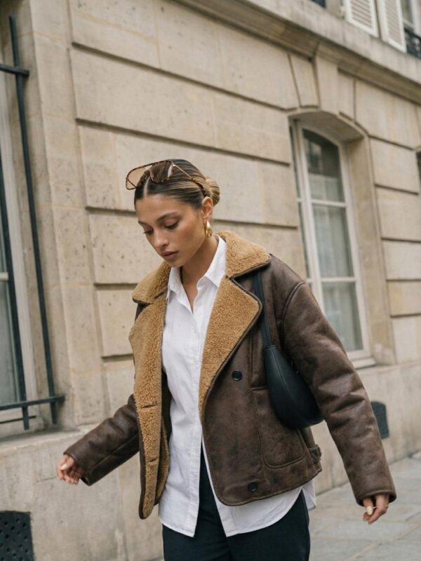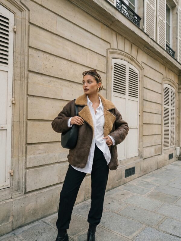 La modelo usa un talle 1 en color camel.