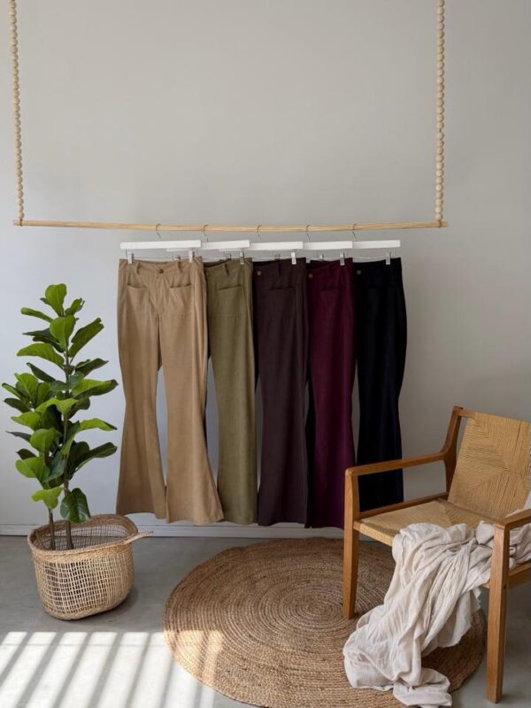 Descripcion: Pantalon de corderoy con evase en el ruedo, cierre y boton.Bolsillos delanteros.