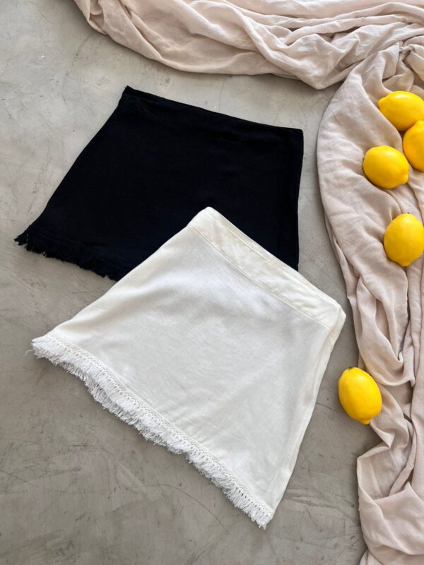 Descripción: falda corta con cierre lateral. Bajo acabado en flecos a tono.