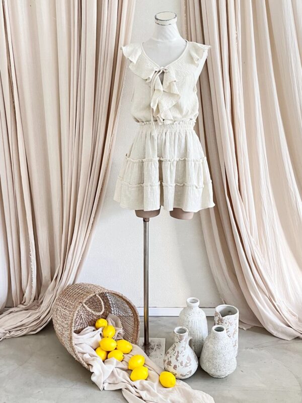 Descripción: falda tiro medio con cintura elastizada. Detalles de volados.