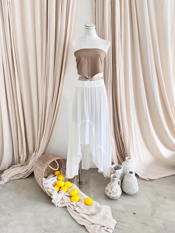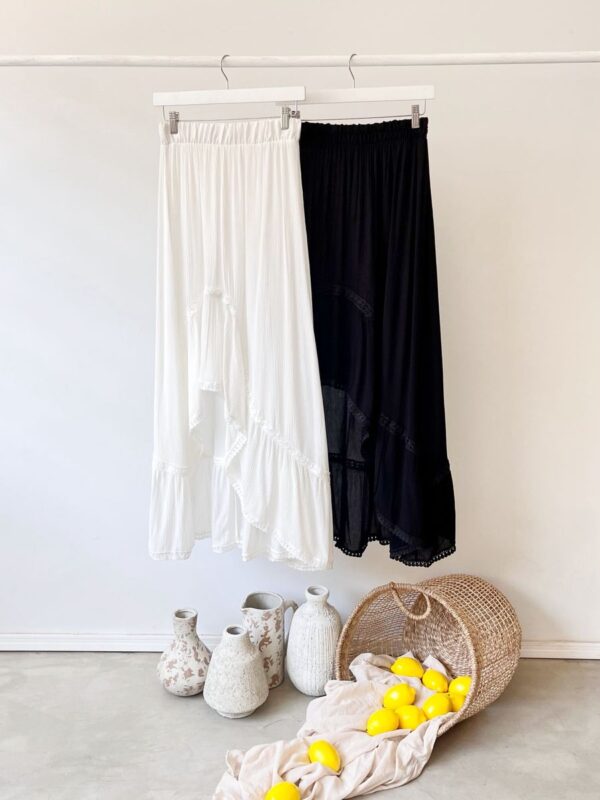 Descripción: Maxifalda con elástico en cintura. Detalle de puntilla en delanteros. Bajo acabados en volados.