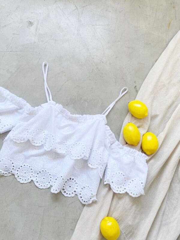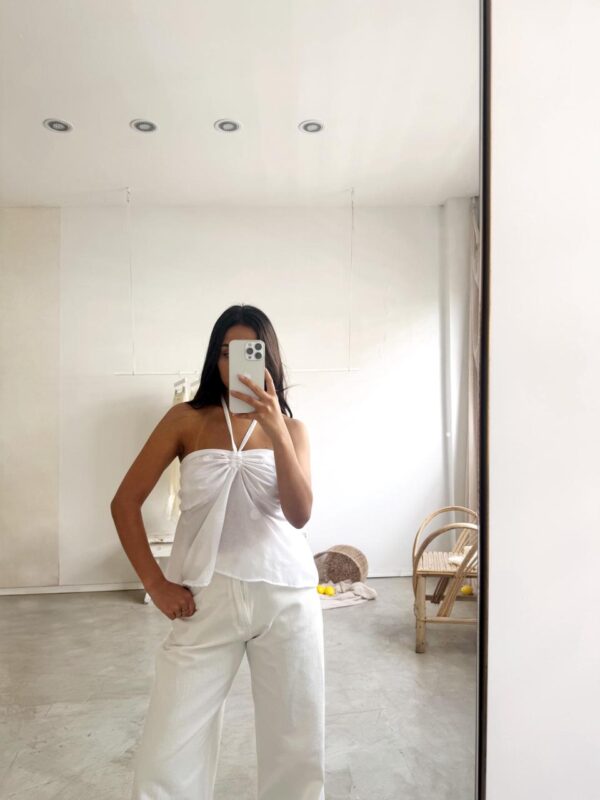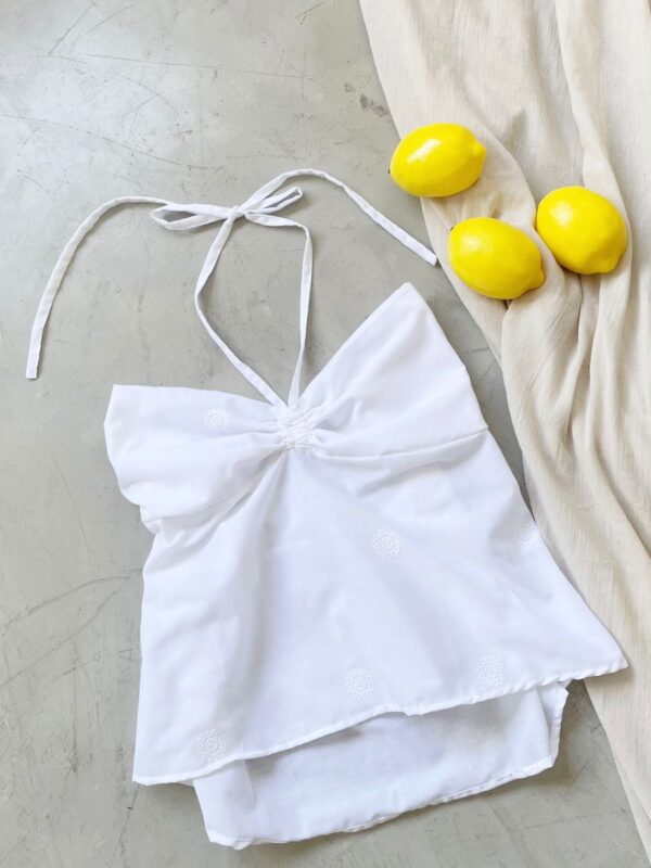 $13,000Descripción: top con lazo en cuello y espalda para atar ajustables. Detalle de puntilla en bordes.