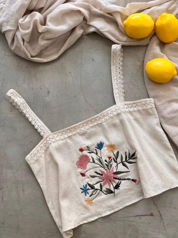 $13,500Descripción: top de escote cuadrado y tirantes de lazos para ajustar según tamaño de busto. Cierre delantero con botones.