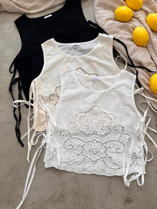 $16,500Descripción: Musculosa con bordes acabados en puntilla. Lazos para atar en delantero.