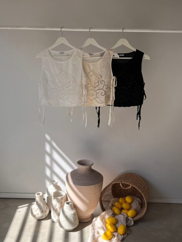 $23,500Descripción: Musculosa de cuello redondo. Tiras para atar en laterales. Detalle de bordado y calado.