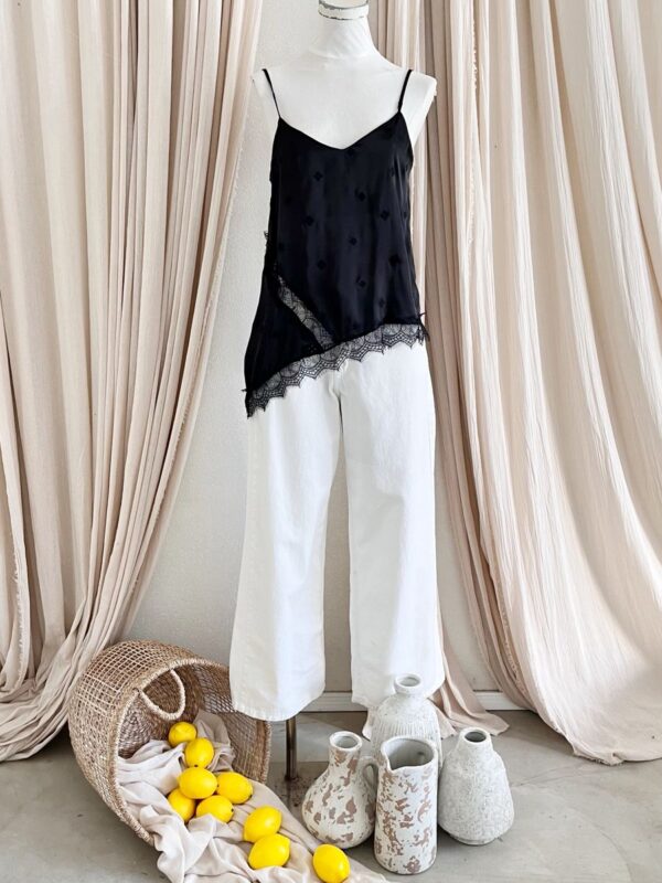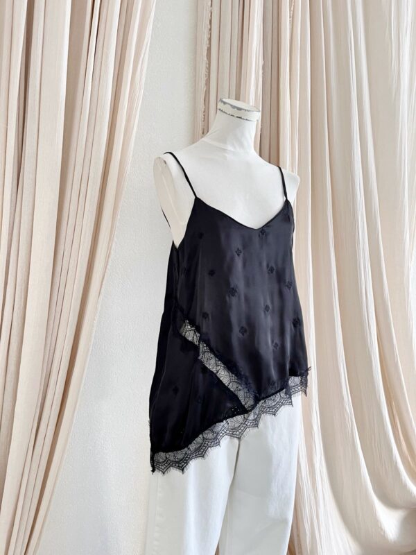 $15,500Descripción: músculosa lencera de escote pico y tirantes finos. Detalle de aplicación de encaje a tono. Bajo asimétrico.