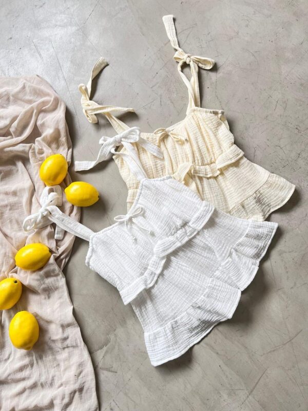 $14,500Descripción: Musculosa de escote recto. Forro interior en busto combinado a tono. Moño delantero decorativo. Bajo acabado en volantes.