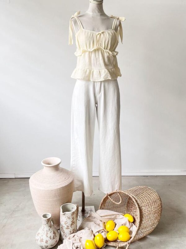$13,000Descripción: top con lazo en cuello y espalda para atar ajustables. Detalle de puntilla en bordes.