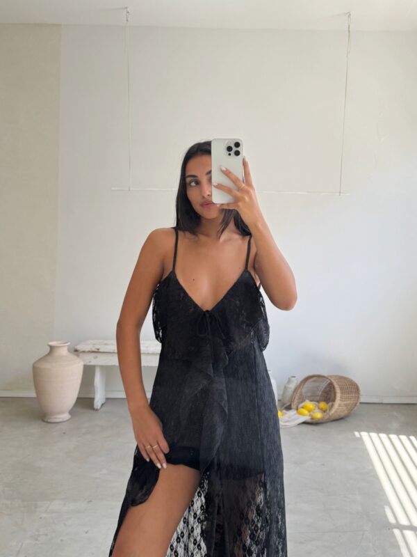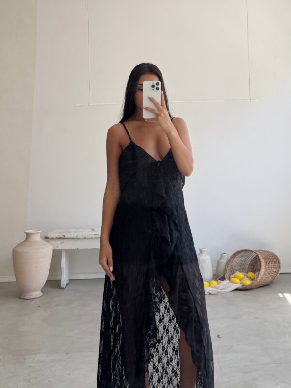 DESCRIPCION: VESTIDO DE ENCAJE NEGRO CON VOLADOS EN TERMINACION ROULOTTE.