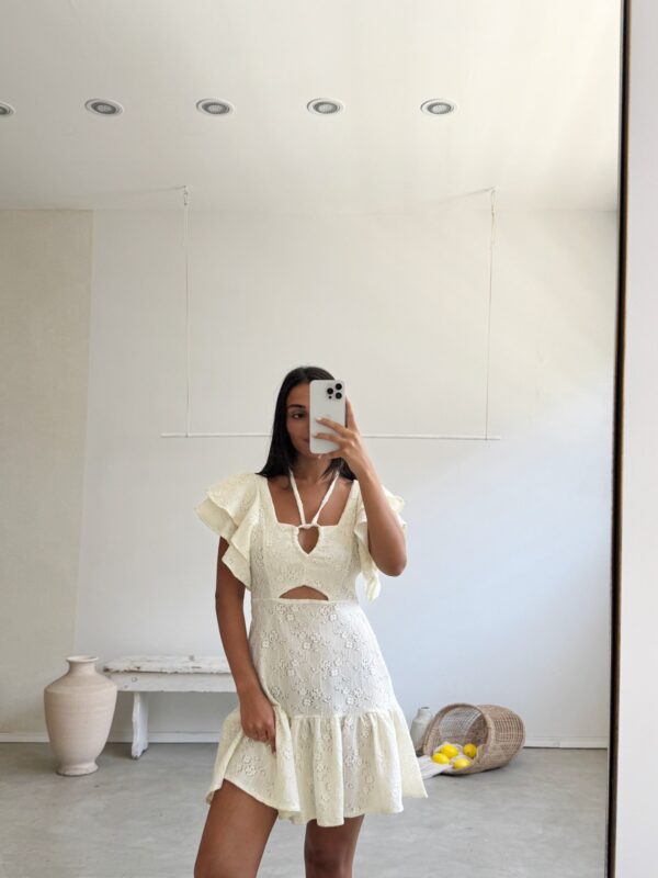 Descripción: vestido corto y manga corta. Terminaciones acabadas en volados. Cordón para regular en cuello. Interior de busto forrado a tono.