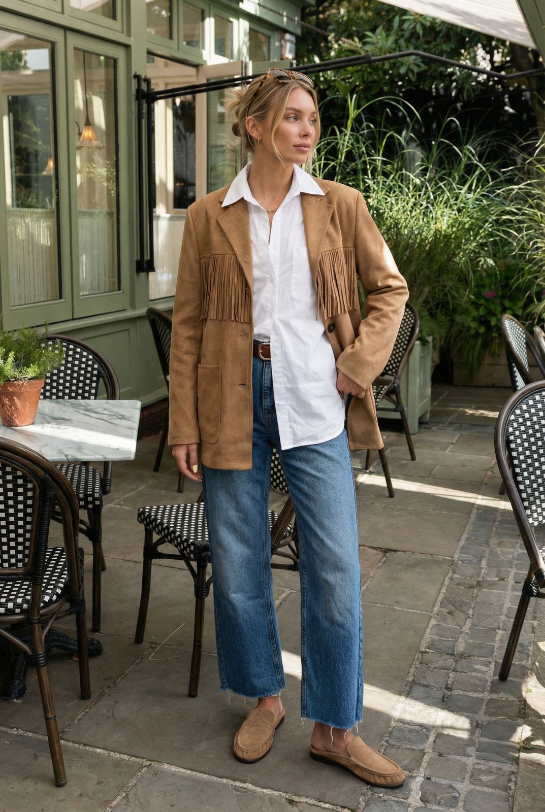 Descripción: Blazer de cuello solapa con bolsillos delanteros. Cierre frontal con botones. Detalle de flecos en delantero y trasero. Incluye hombreras.