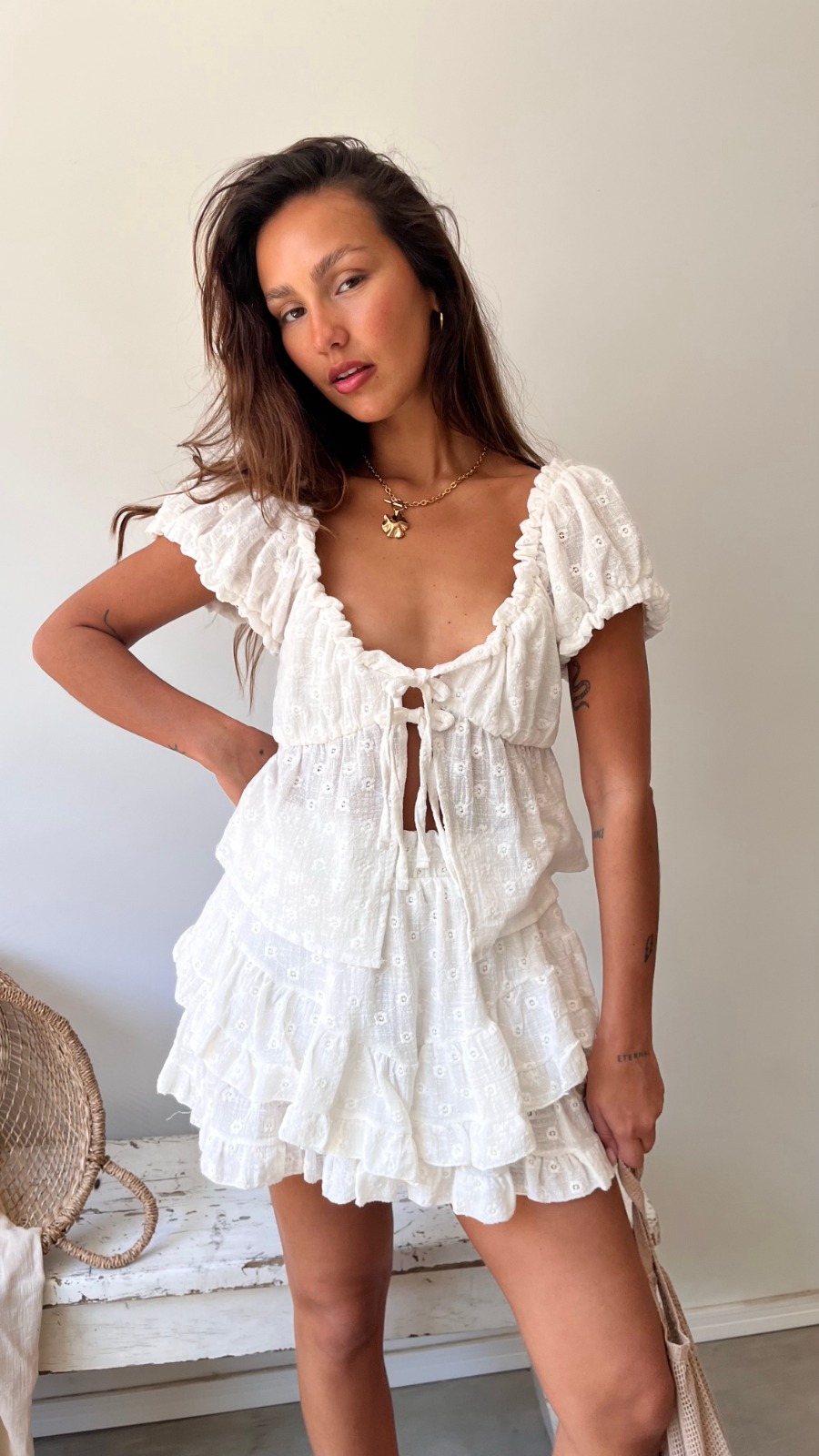 Descripción: Blusa de mangas cortas con bajo elástico. Moños decorativos. Detalle de bordado.
