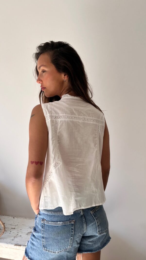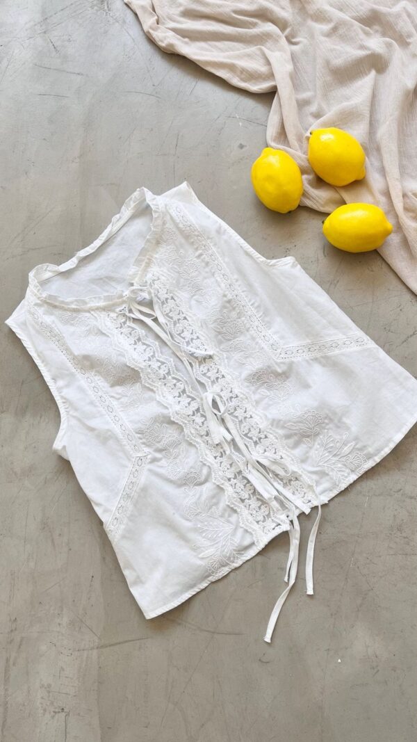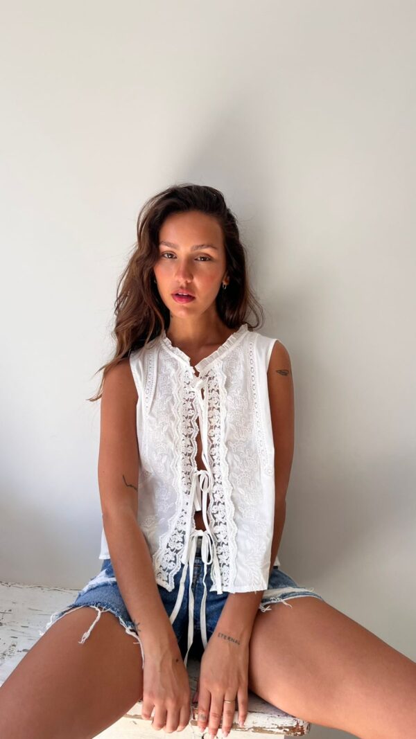 Descripción: Blusa de cuello redondo con manga sisa. Terminaciones delanteras con puntilla. Moños decorativos para atar.