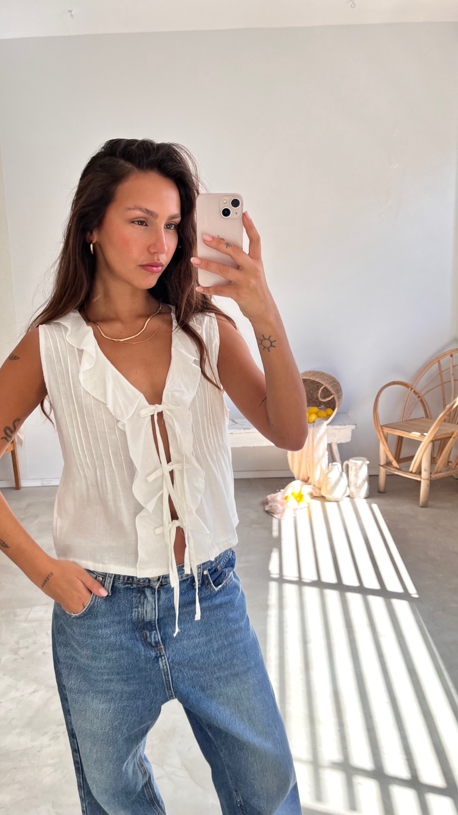 Descripción: Blusa de escote pico con volantes en delantero. Moños delanteros decorativos.