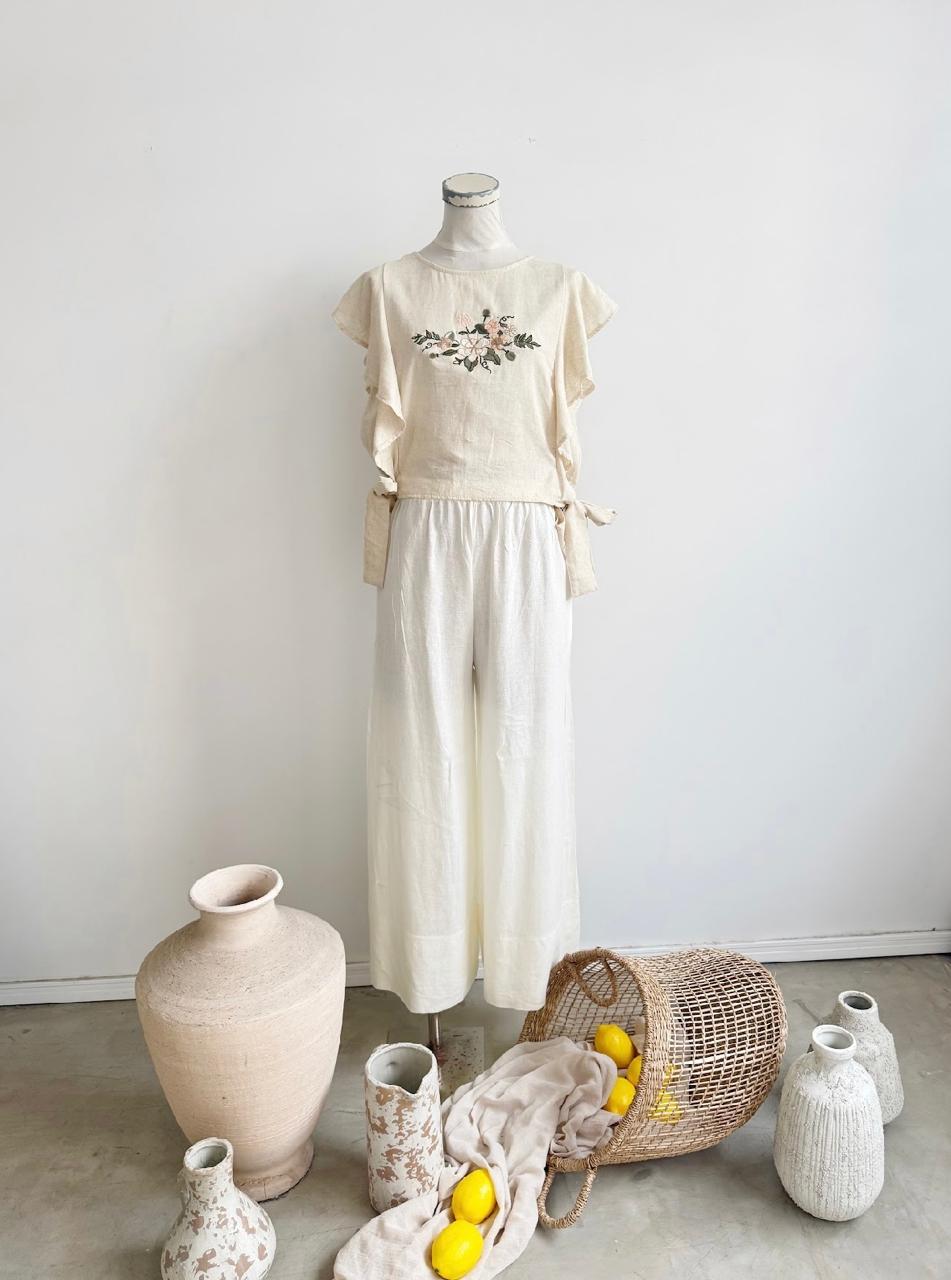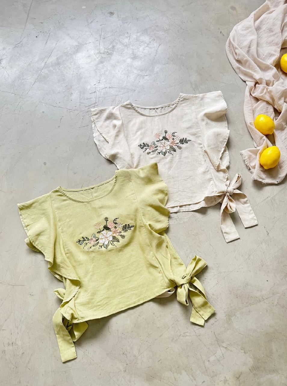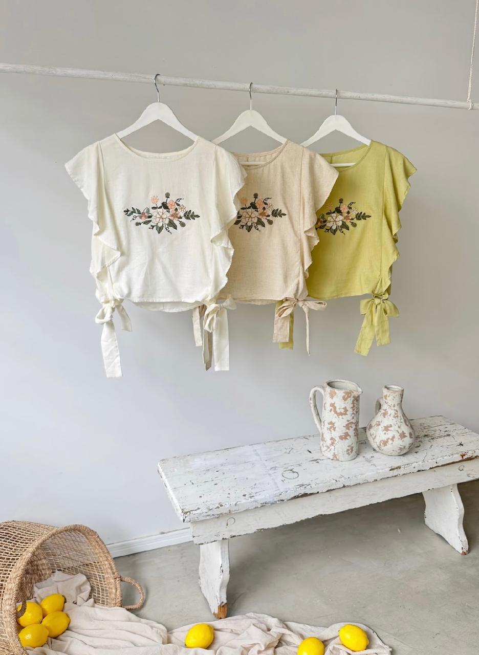 Descripción: Blusa de cuello redondo. Moños decorativos laterales. Detalle de bordado en delantero.