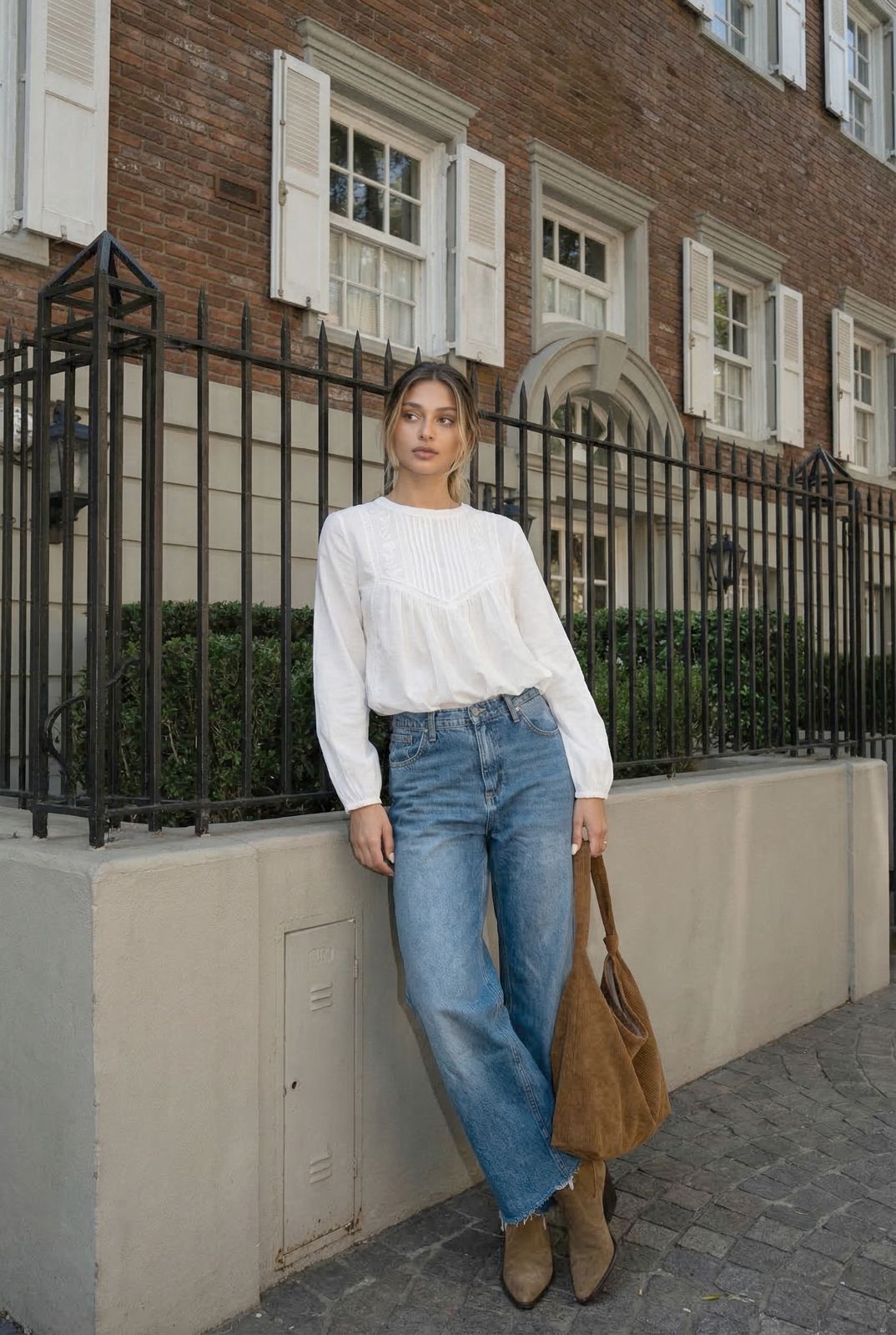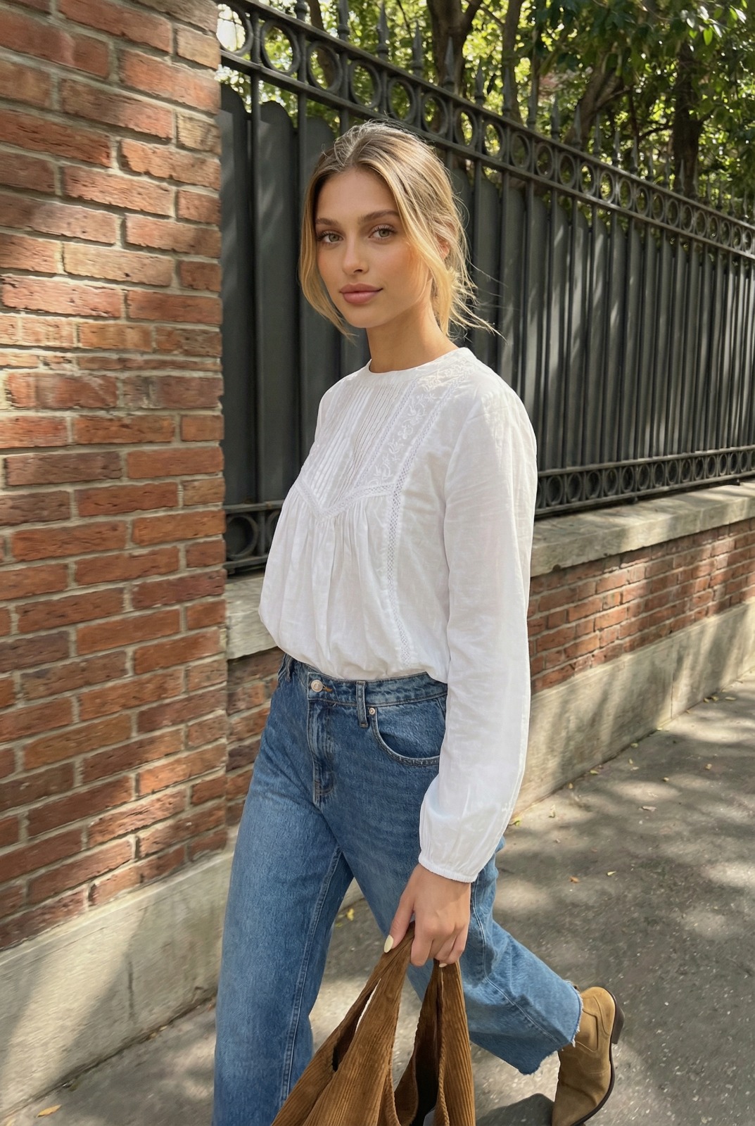 Descripción: Blusa de cuello redondo con lazo para atar en trasero. Mangas largas terminadas en elástico. Detalle de puntilla y bordado combinado a tono.