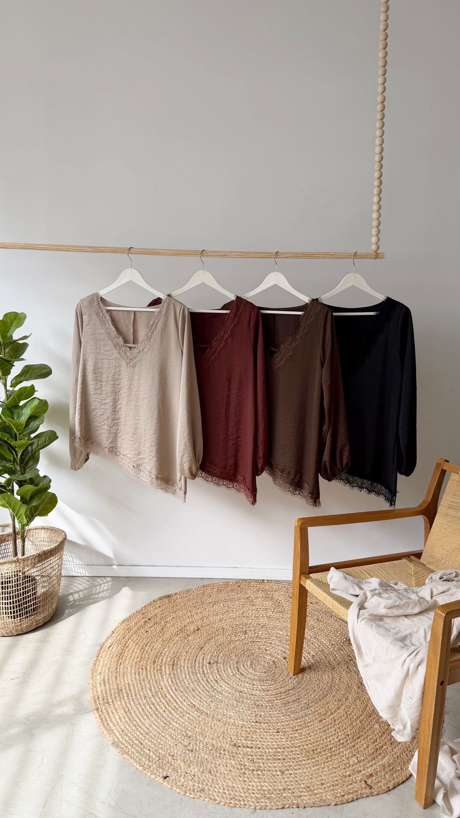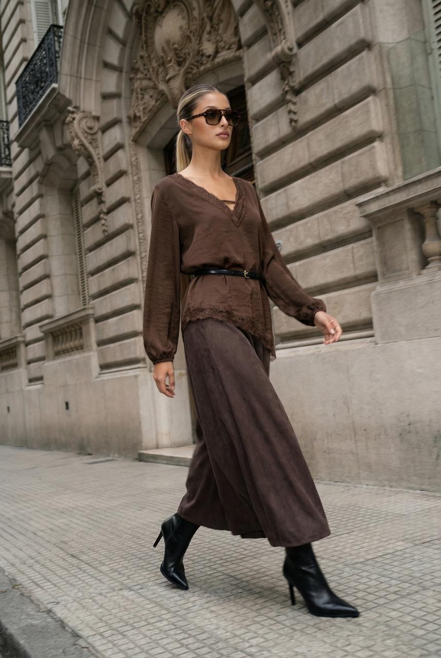 Descripción: Blusa de escote v y bajo irregular terminados en puntilla. Mangas largas acabadas en elástico.