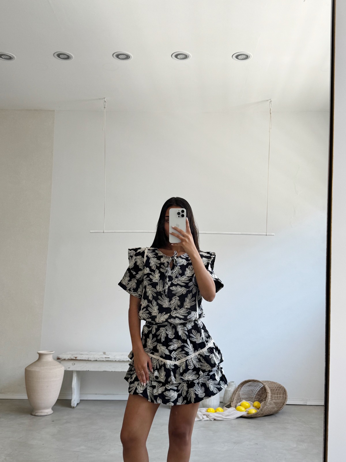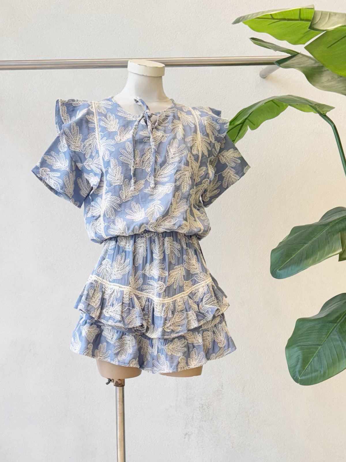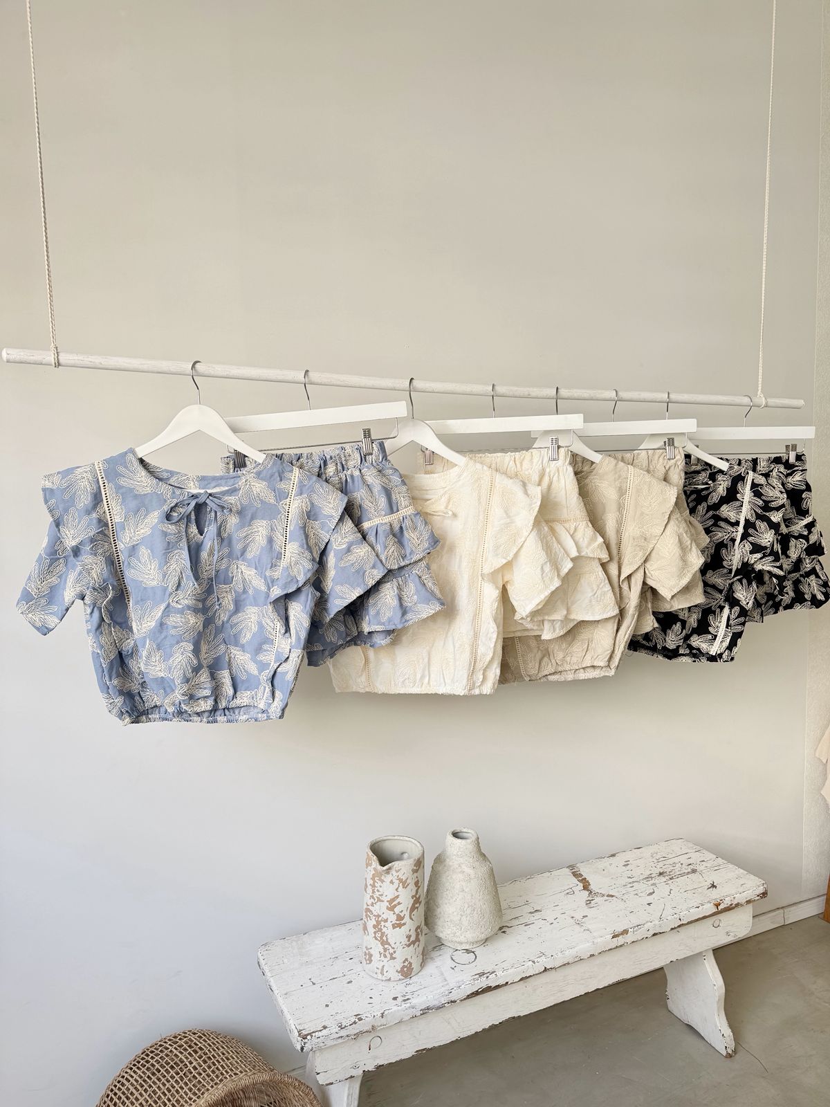 Descripción: Blusa de cuello redondo detalle de cordón para atar en delantero. Mangas cortas con detalle de volados.
