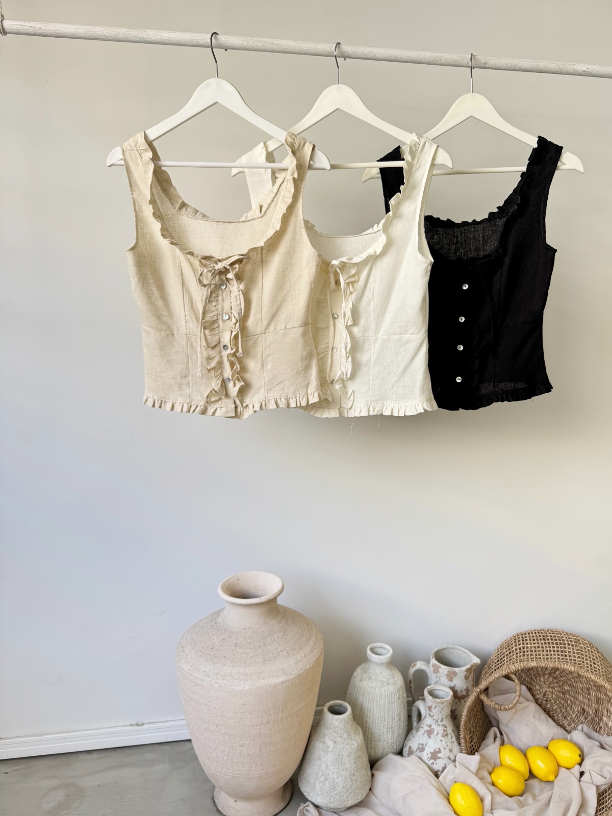 Descripción: blusa de cuello redondo. Detalles de botones delanteros y moño decorativo. Terminaciones acabadas en voladitos.