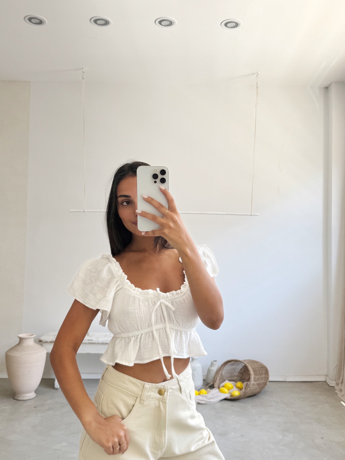Descripción: blusa de cuello redondo. Detalle de volantes delantero de la misma tela. Detalle de cordón. Mangas largas.