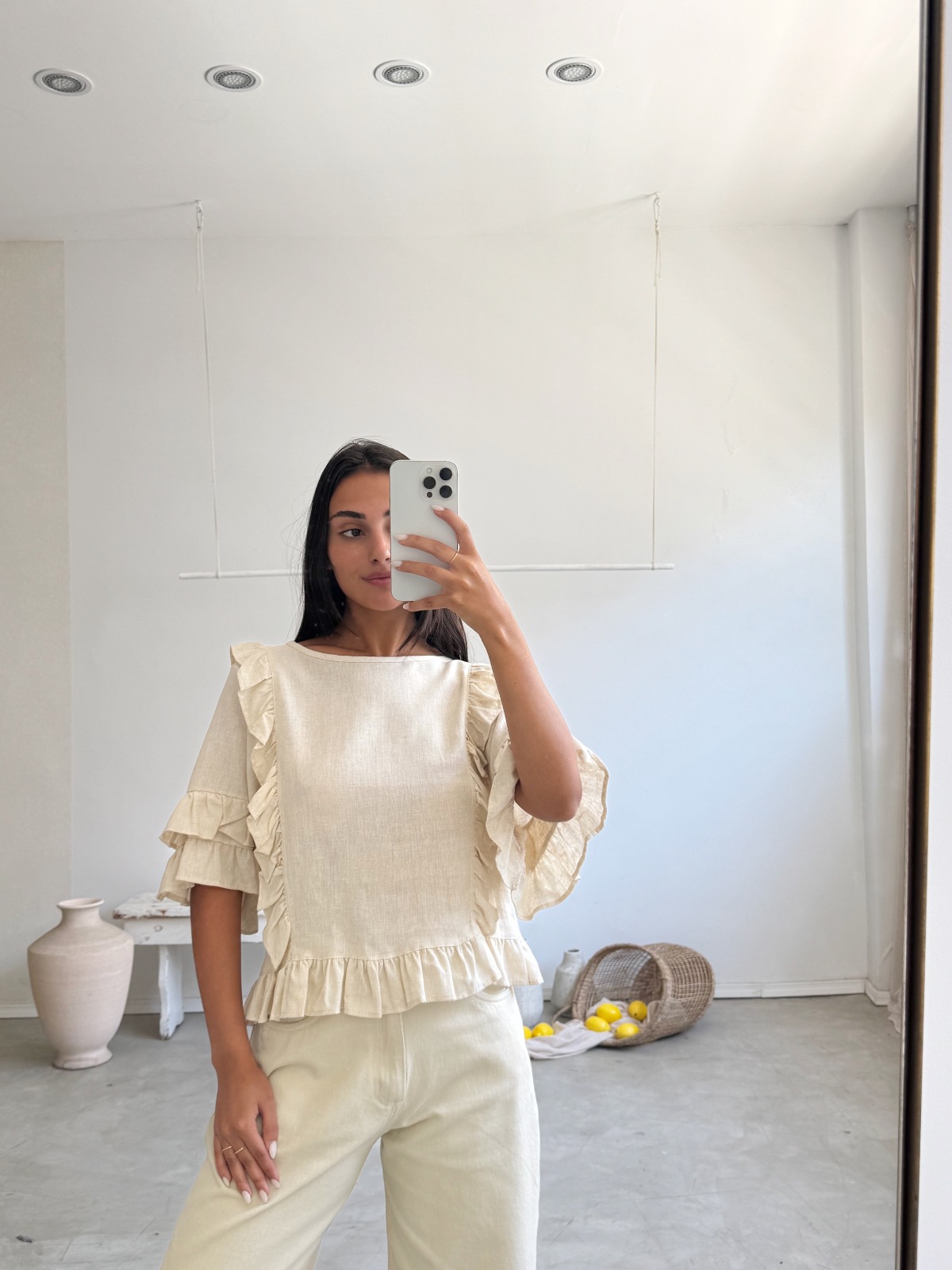Descripción: blusa con cuello redondo. Manga cortas. Terminaciones acabadas en volados.