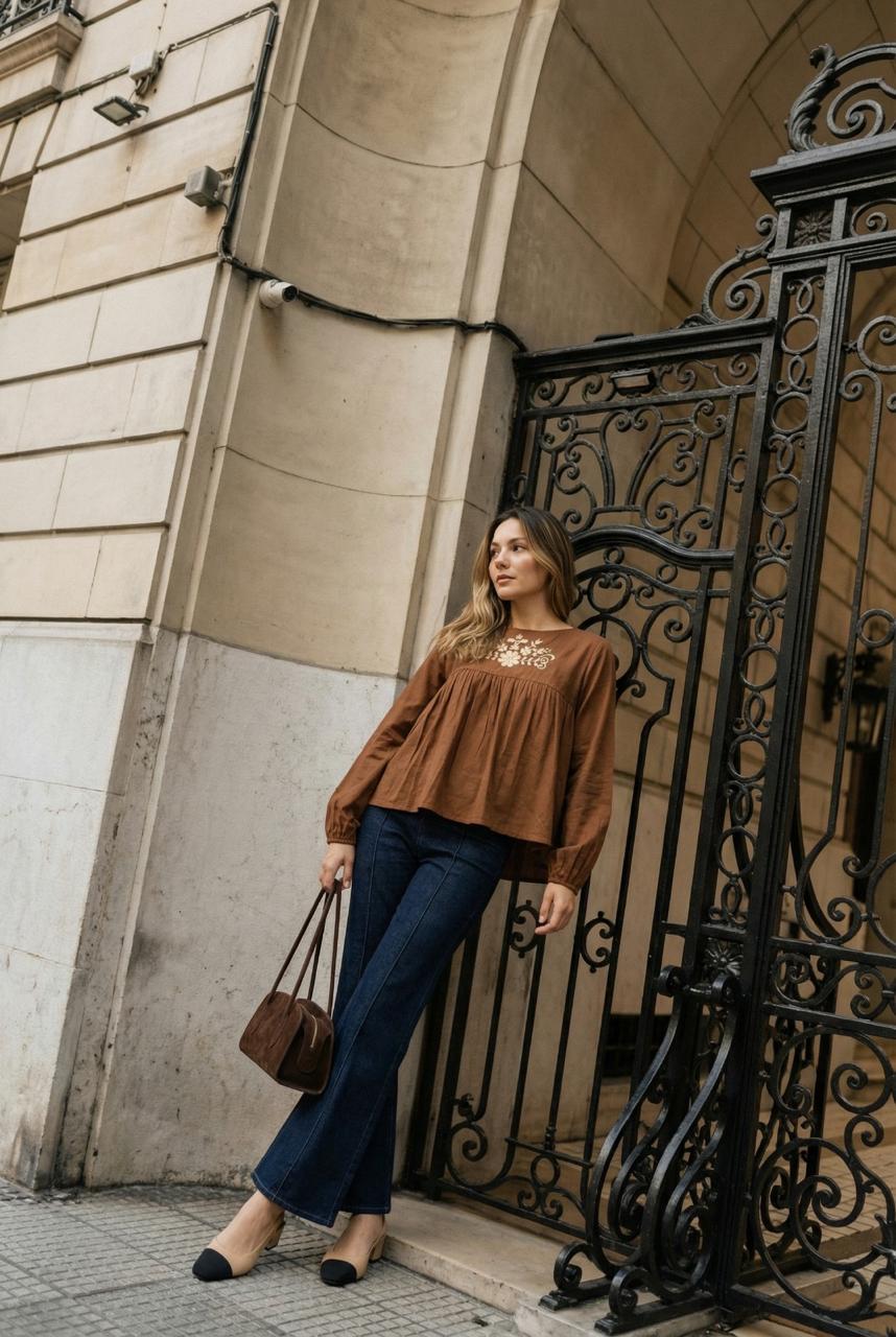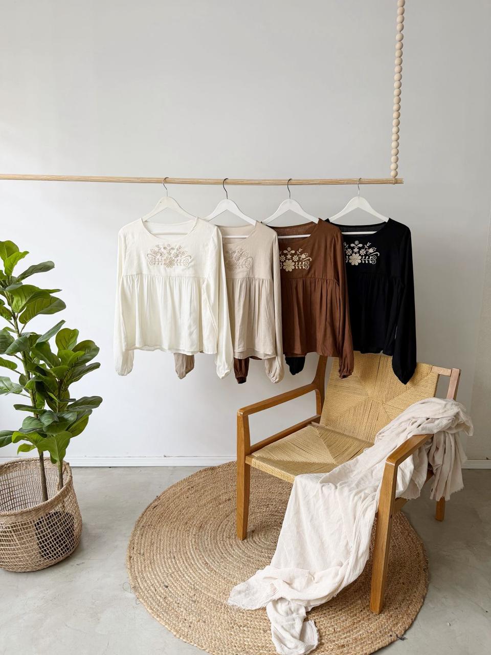 Descripción: blusa de cuello redondo. Mangas largas abullonadas terminadas en elástico. Detalle de bordado en delantero.