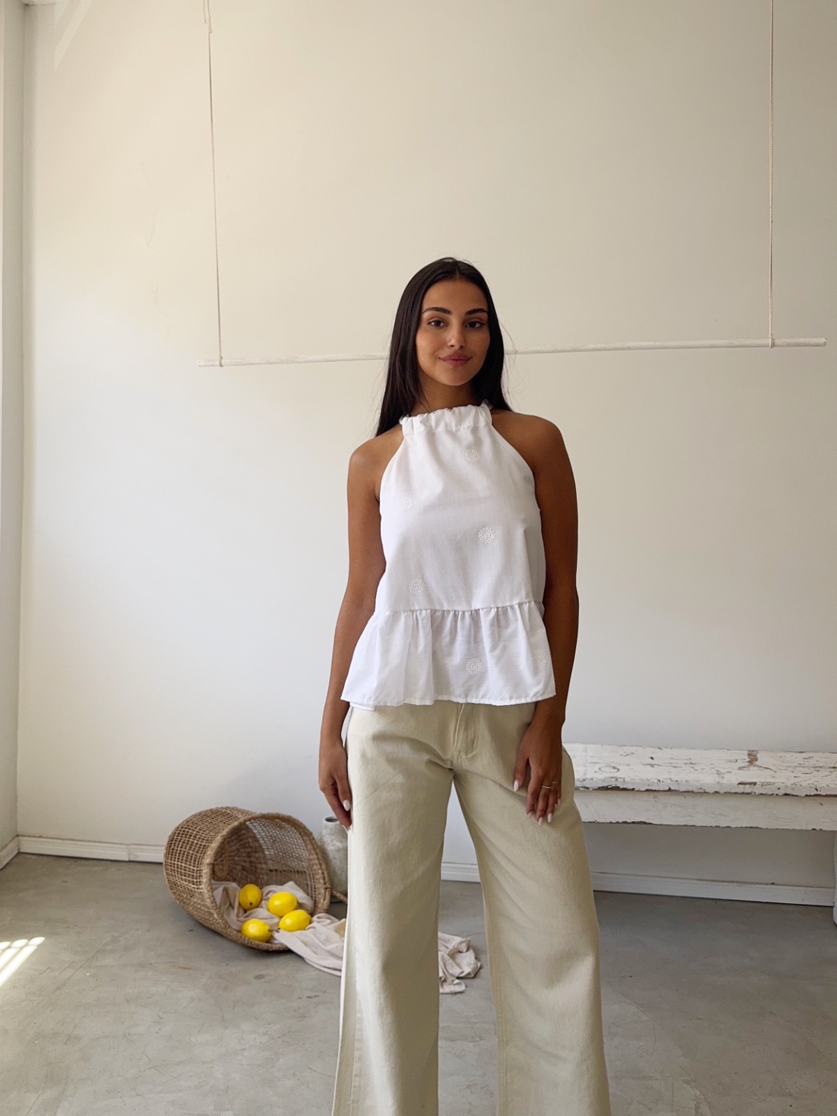 Descripción: Blusa de cuello recto subido con cordón ajustable. Forro interior combinado a tono. Bajo terminado en volados.