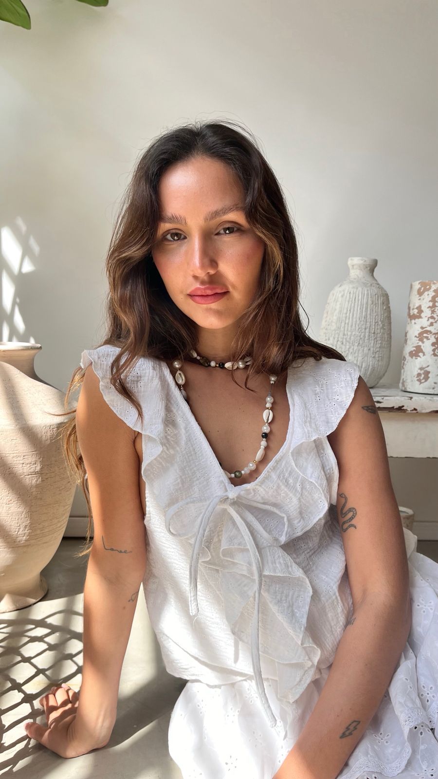 Descripción: blusa de cuello redondo. Detalle de volantes delantero de la misma tela. Detalle de cordón. Mangas largas.
