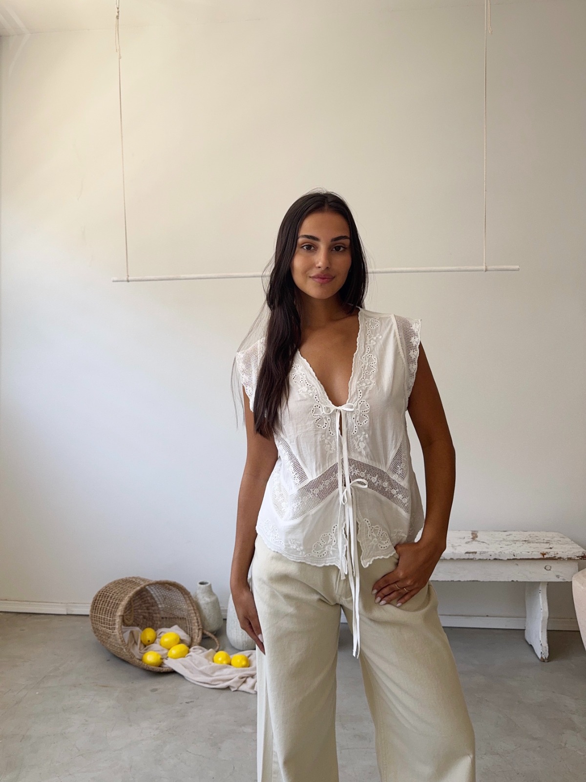 Descripción: Blusa con escote pico. Detalles de transparencias y bordados. Lazos delanteros para atar.