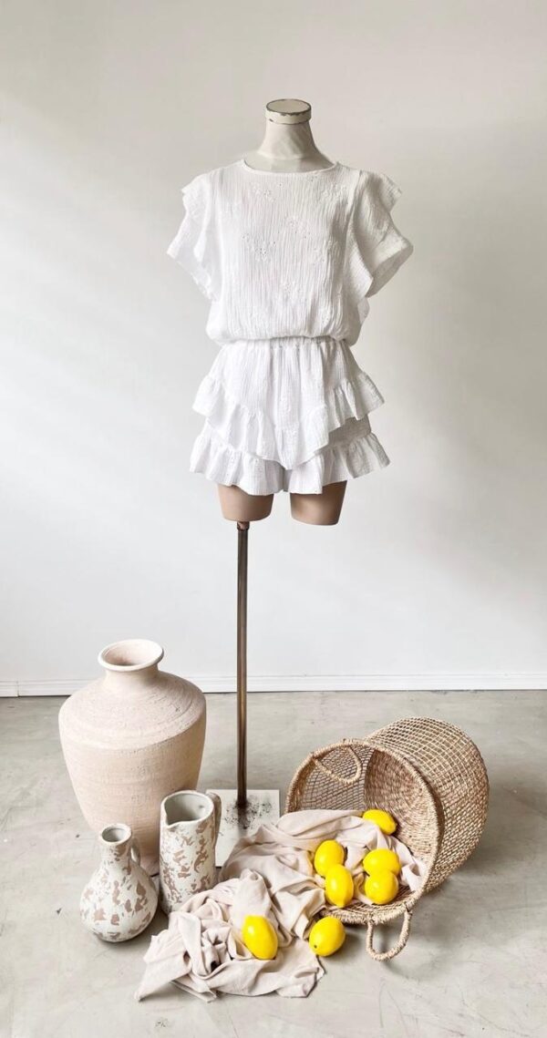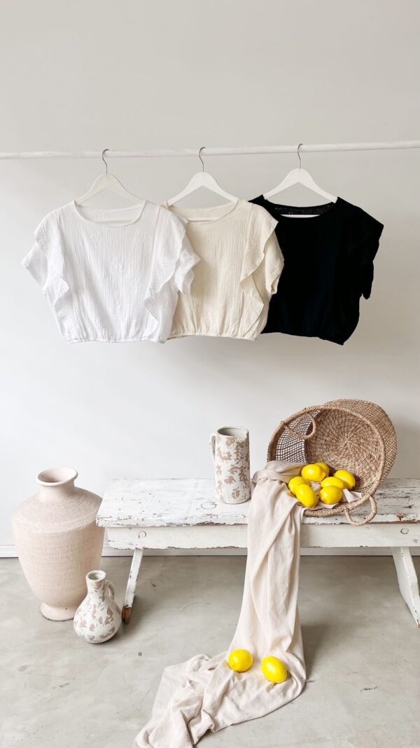 Descripción: Blusa de escote redondo. Detalles de volantes. Bajo acabo en elástico.