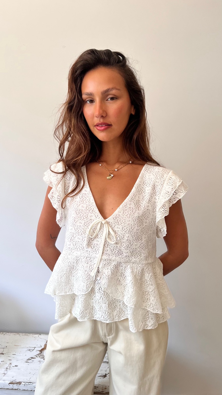 Descripción: Blusa con escote pico. Manga corta terminada en volados. Lazo decorativo en delantero. Bajo terminado en volados. Interior con forro a tono.