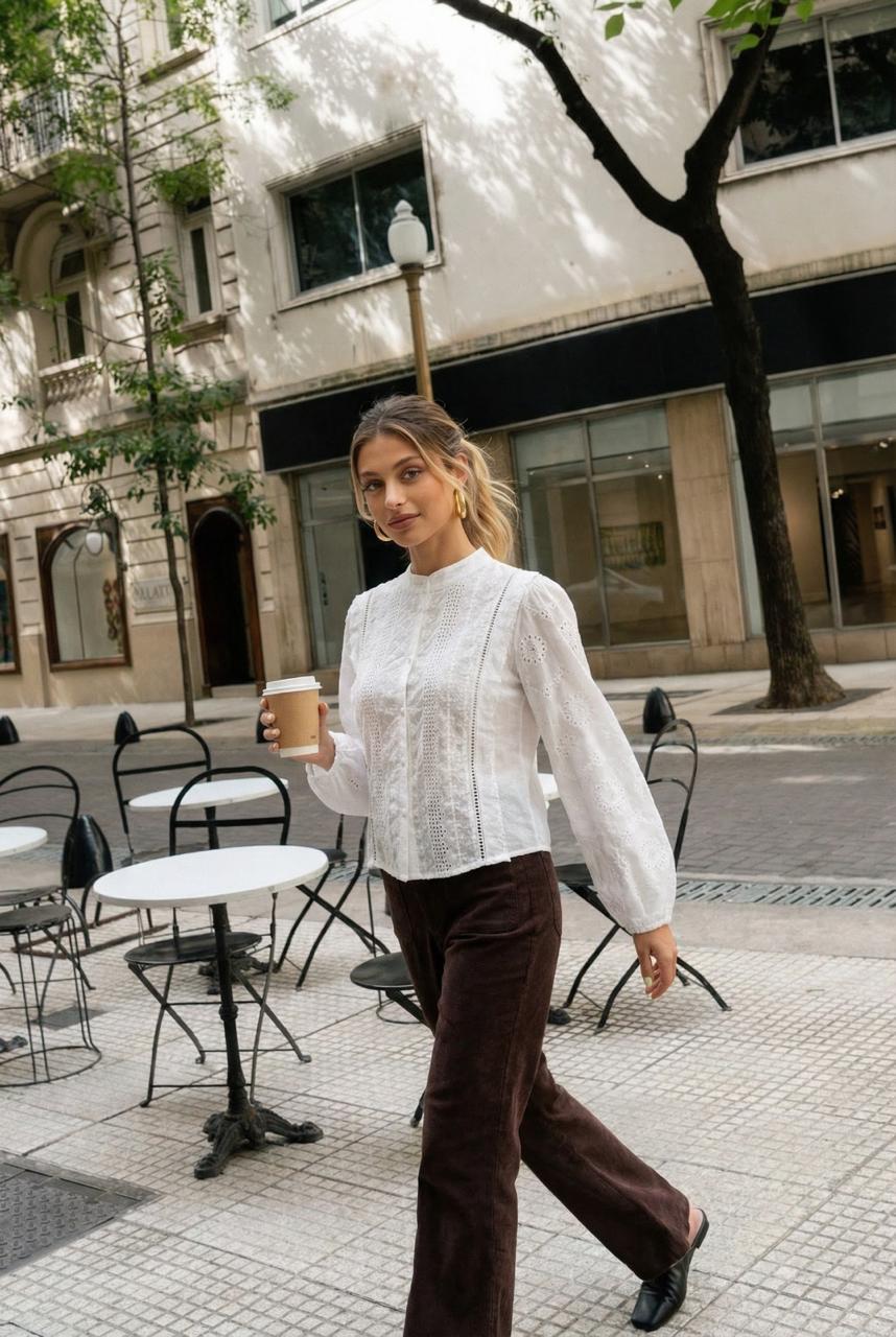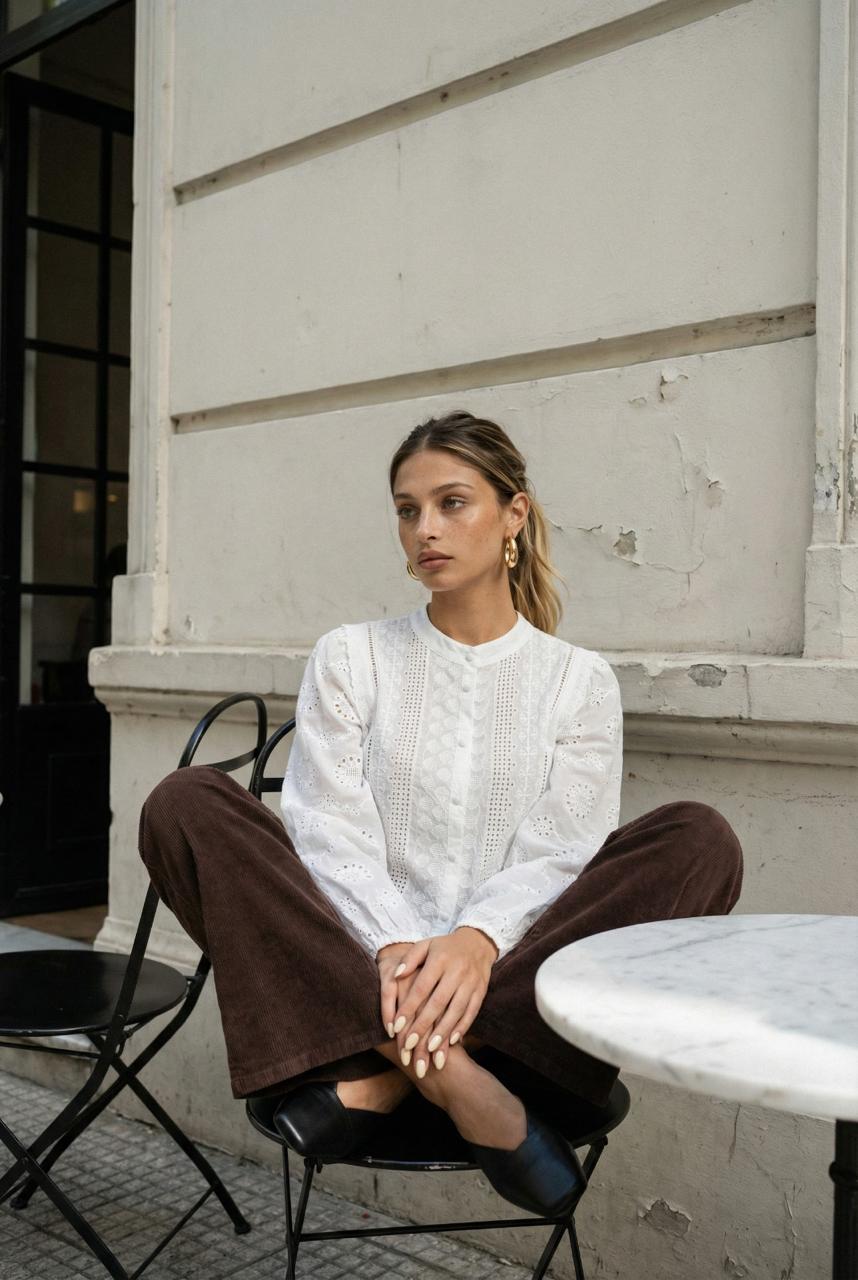 Descripción: Blusa de cuello redondo. Mangas largas terminadas en elástico. Detalles con puntillas. Botones forrados combinados a tono.