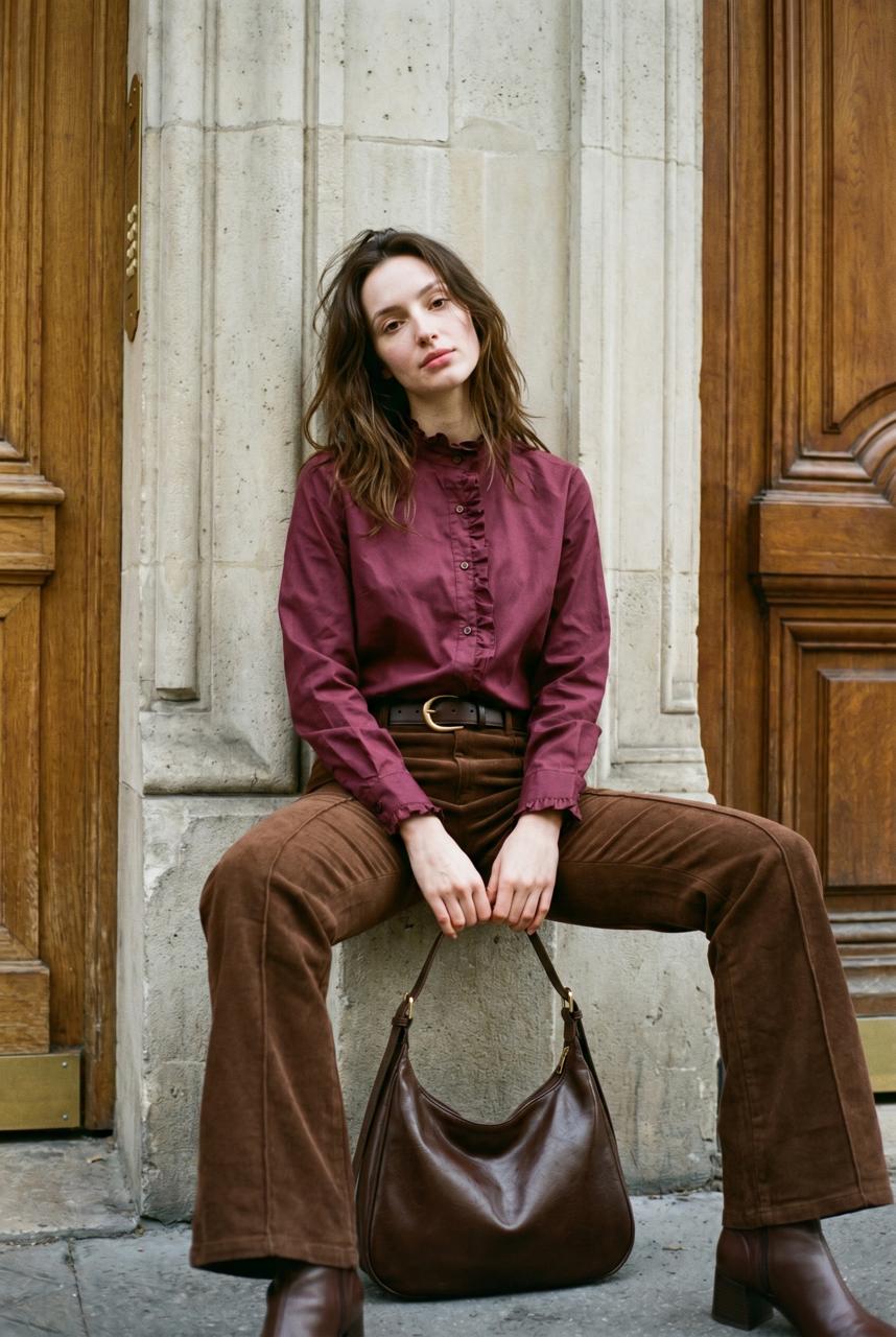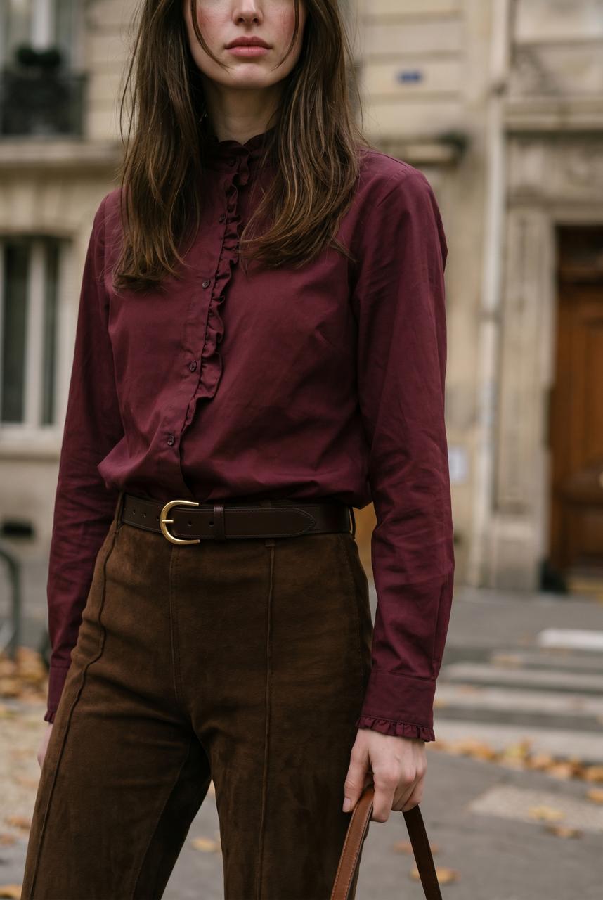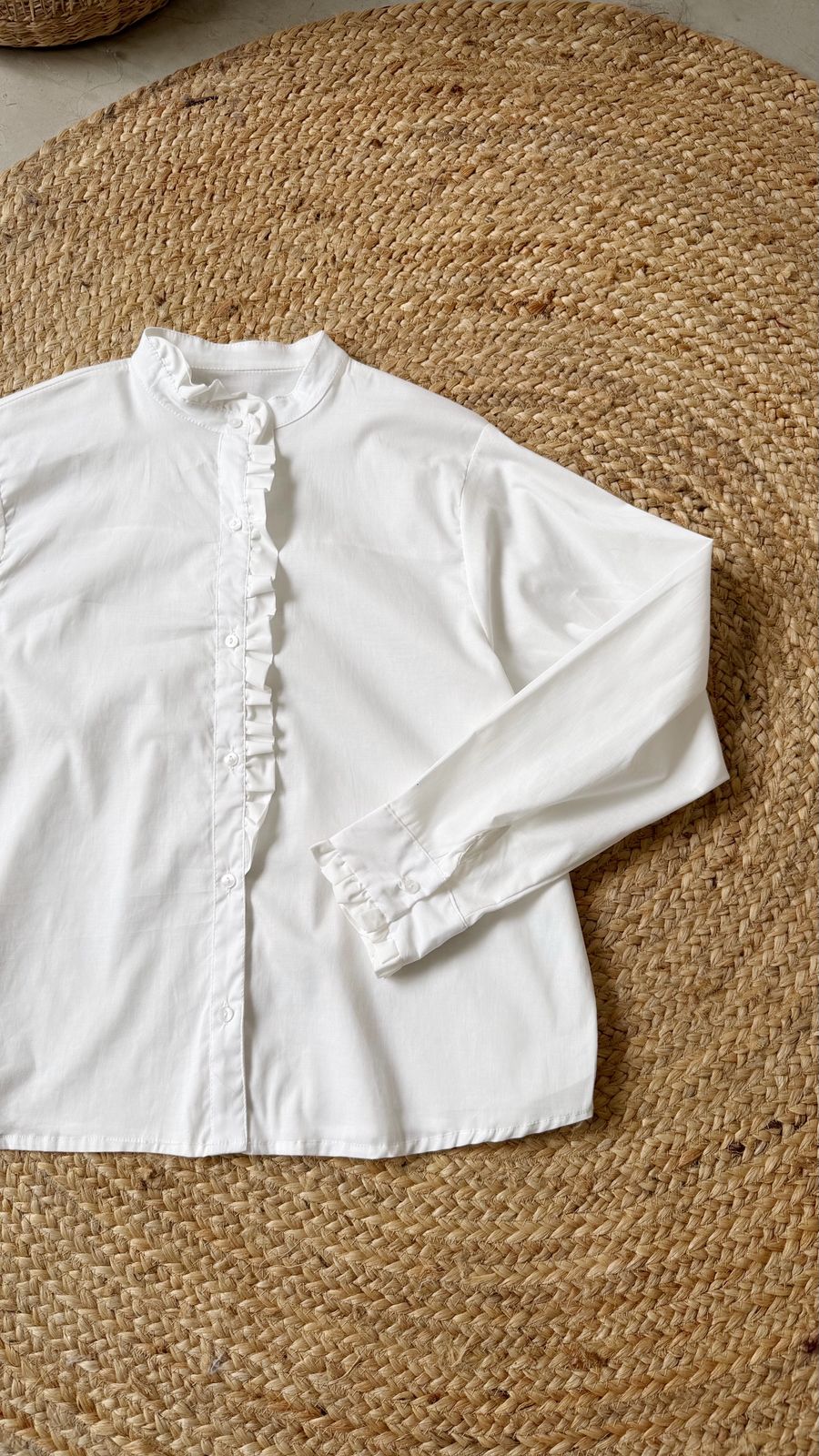 Descripción: Camisa de cuello redondo con mangas largas terminadas en puño y volado. Cierre frontal con botones. Detalle delantero de volados.