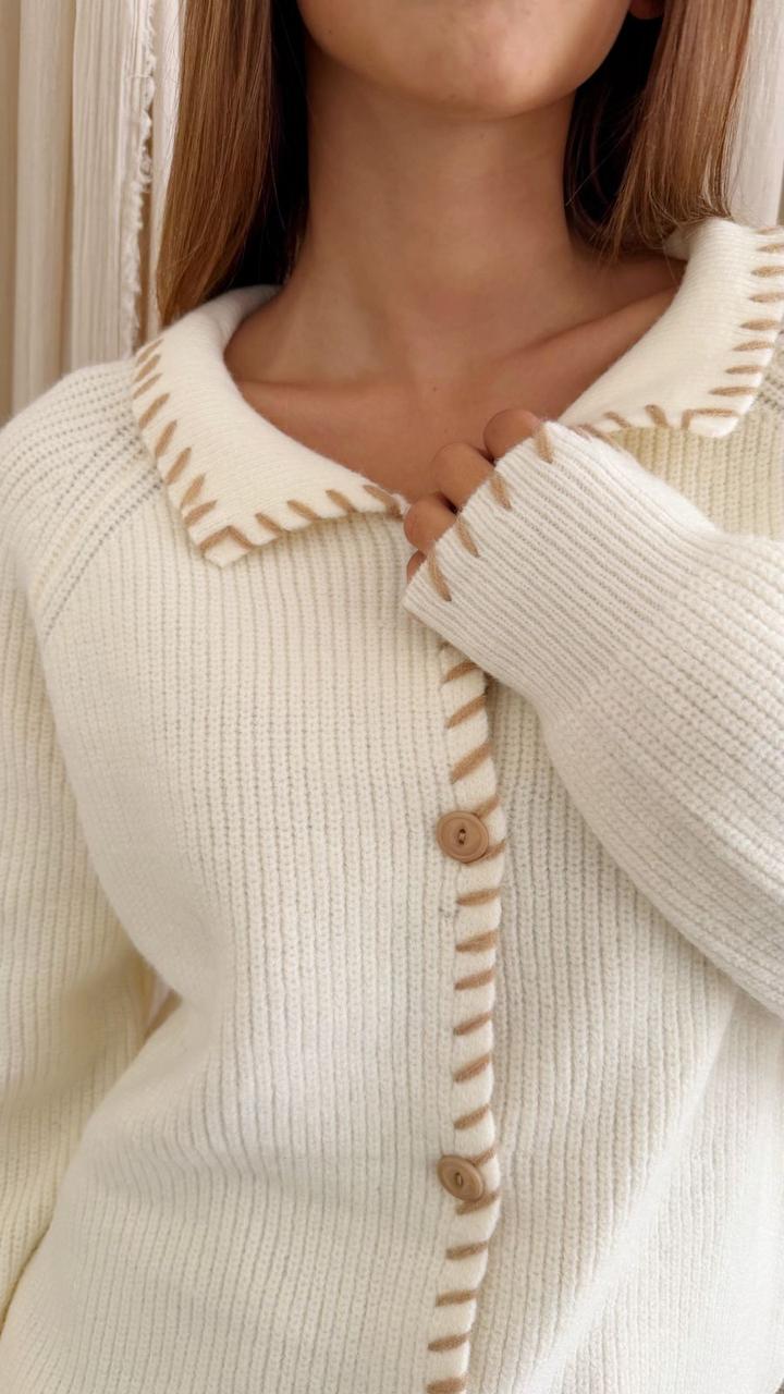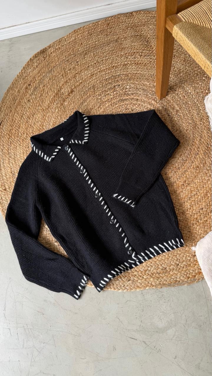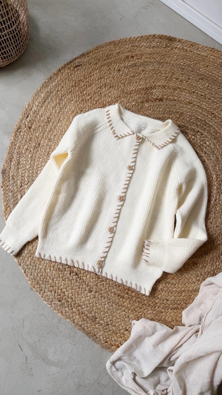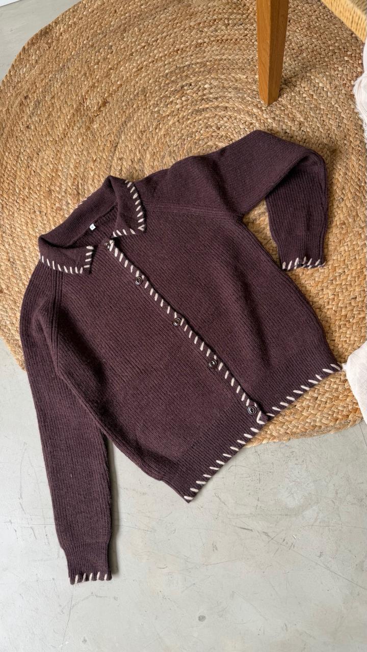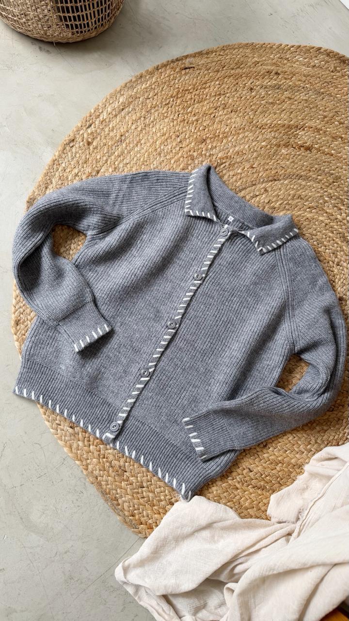 Descripción: Cardigan cuello solapa con mangas largas. Detalle de botones en delantero. Detalles con hilo en terminaciones.