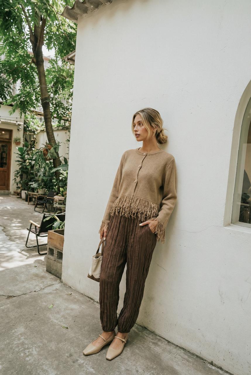 Descripción: Cardigan de cuello redondo y mangas largas. Detalles de acabados con flecos. Cierre frontal con botones metálicos.