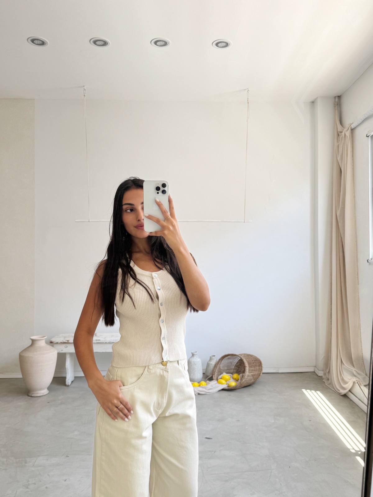 Descripción: blusa de cuello babero. Detalle en bajo con cordon para atar y botones delanteros.