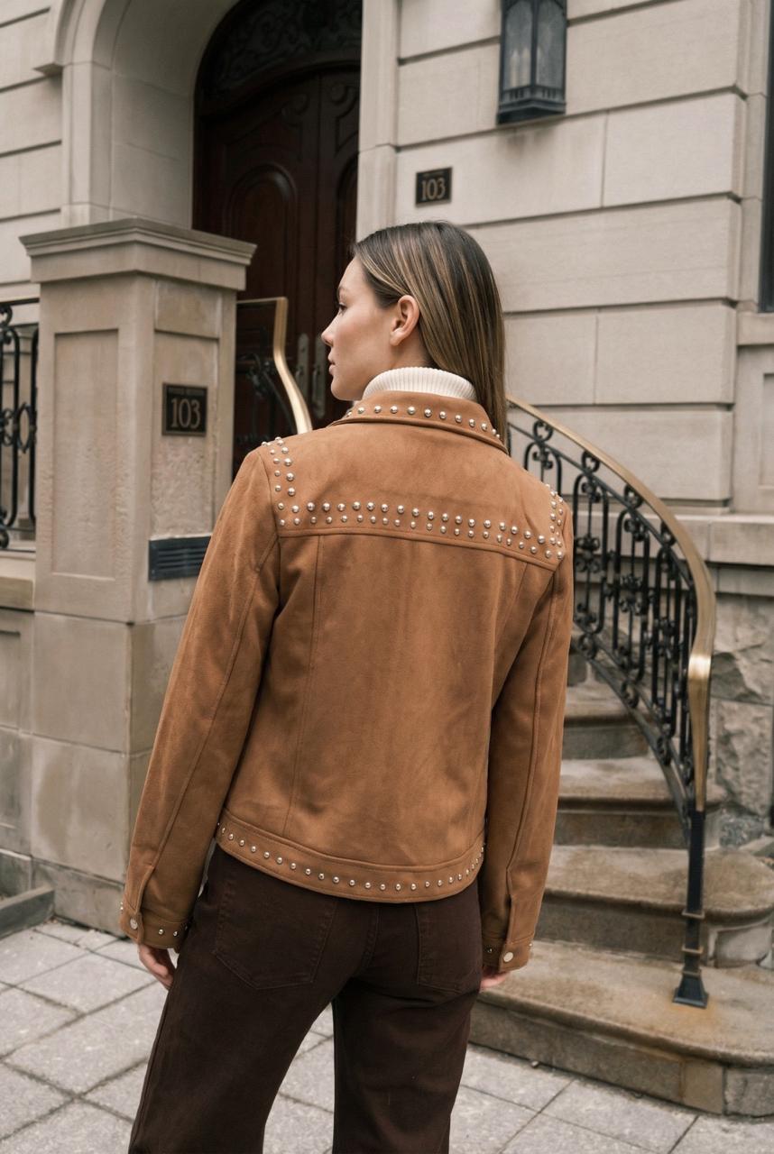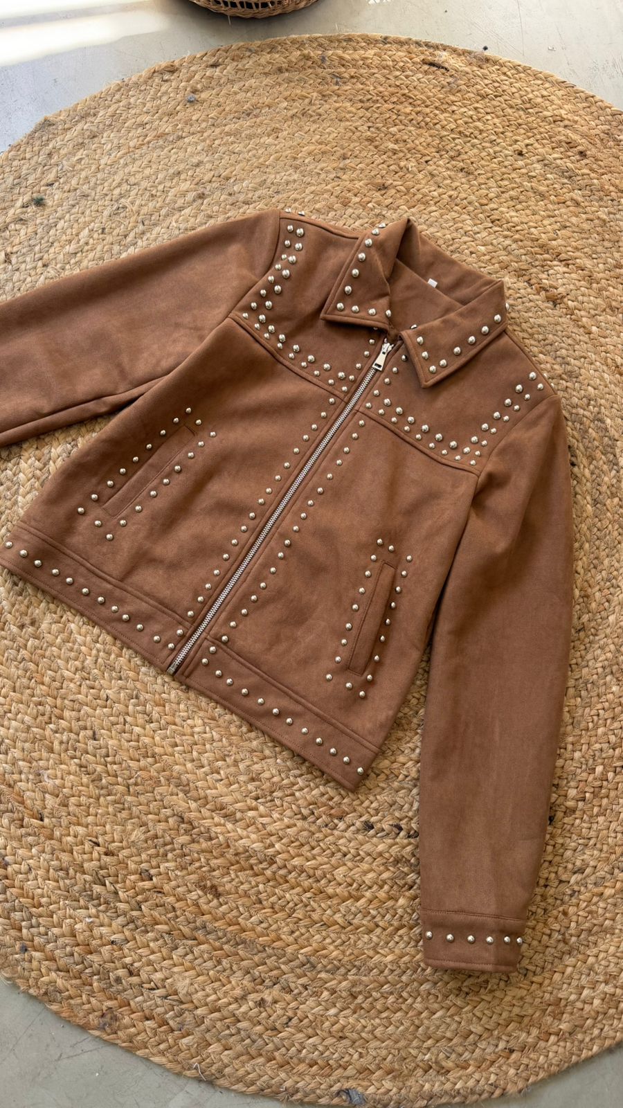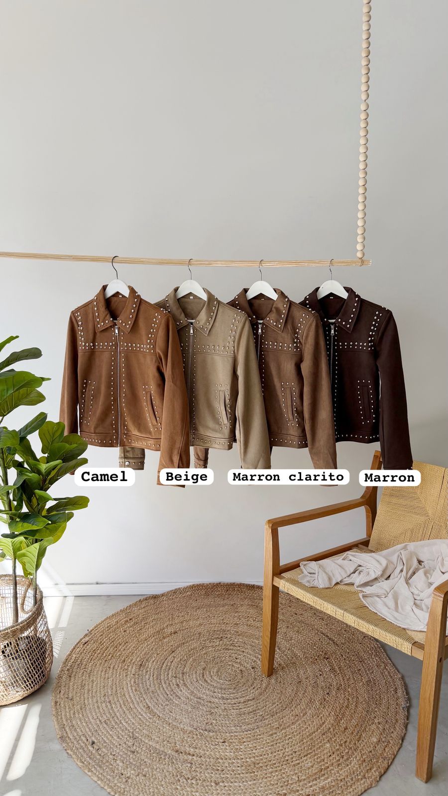 Descripción: Campera de cuello solapa con mangas largas. Cierre delantero metálico. Detalle de tachas.