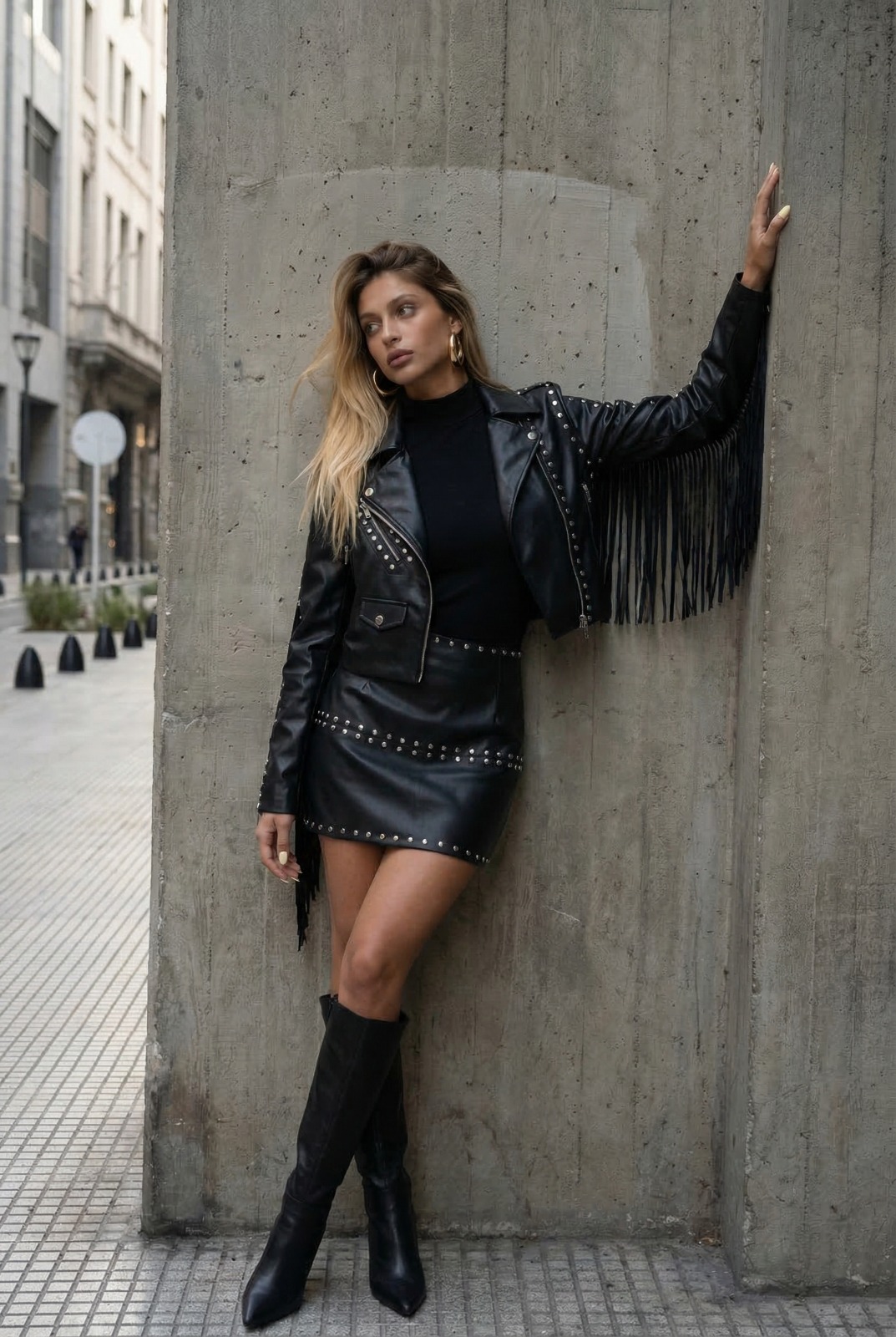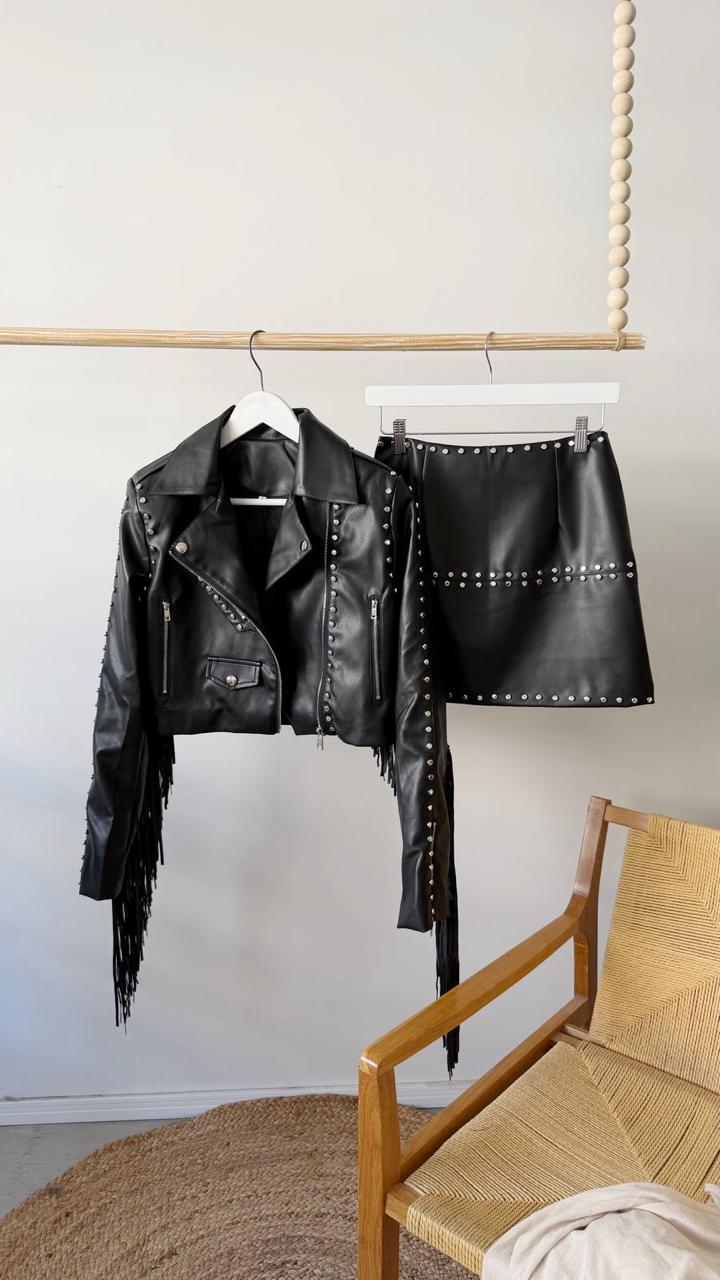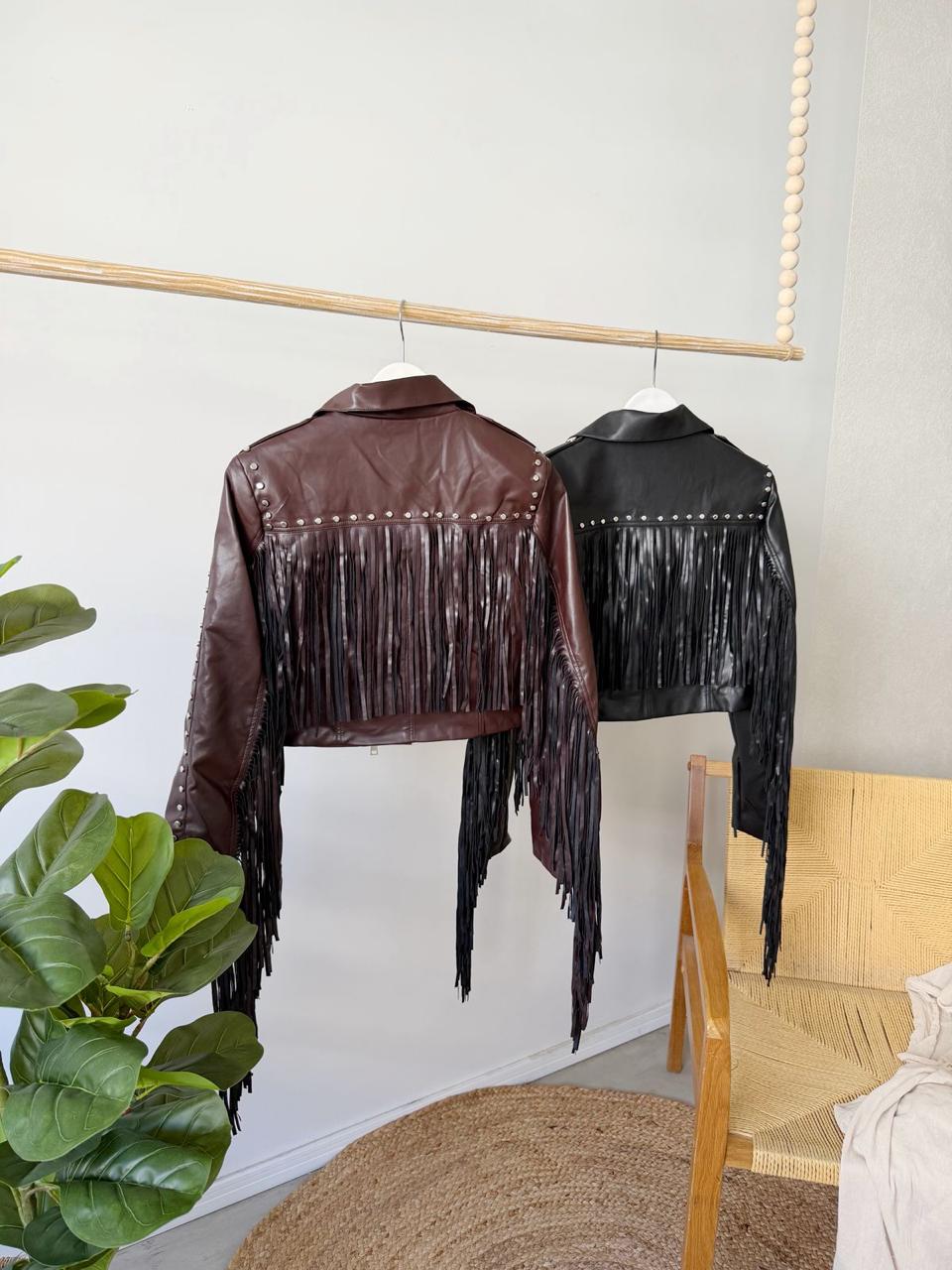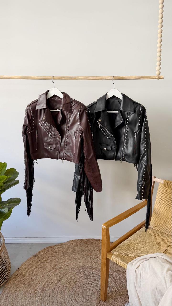 Descripción: Chaqueta corta de cuello solapa. Cierre frontal con cremallera metálica y botones decorativos. Bolsillos delanteros. Detalles de flecos y tachas en mangas y trasero.