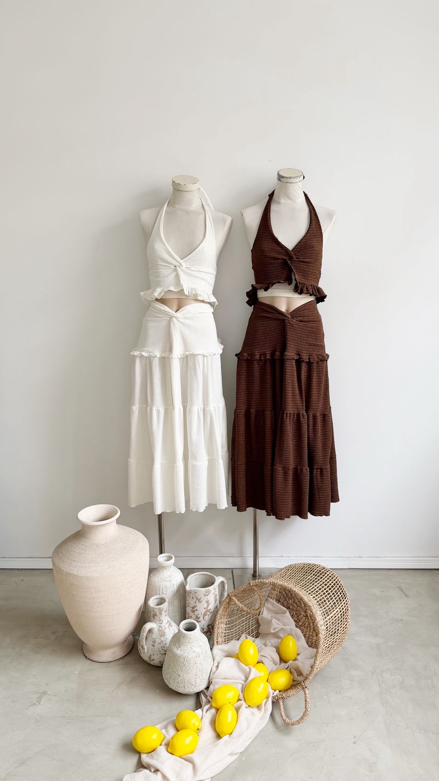 Descripcion: Vestido con hilo elastico en cintura. Tira para atar en escote.
