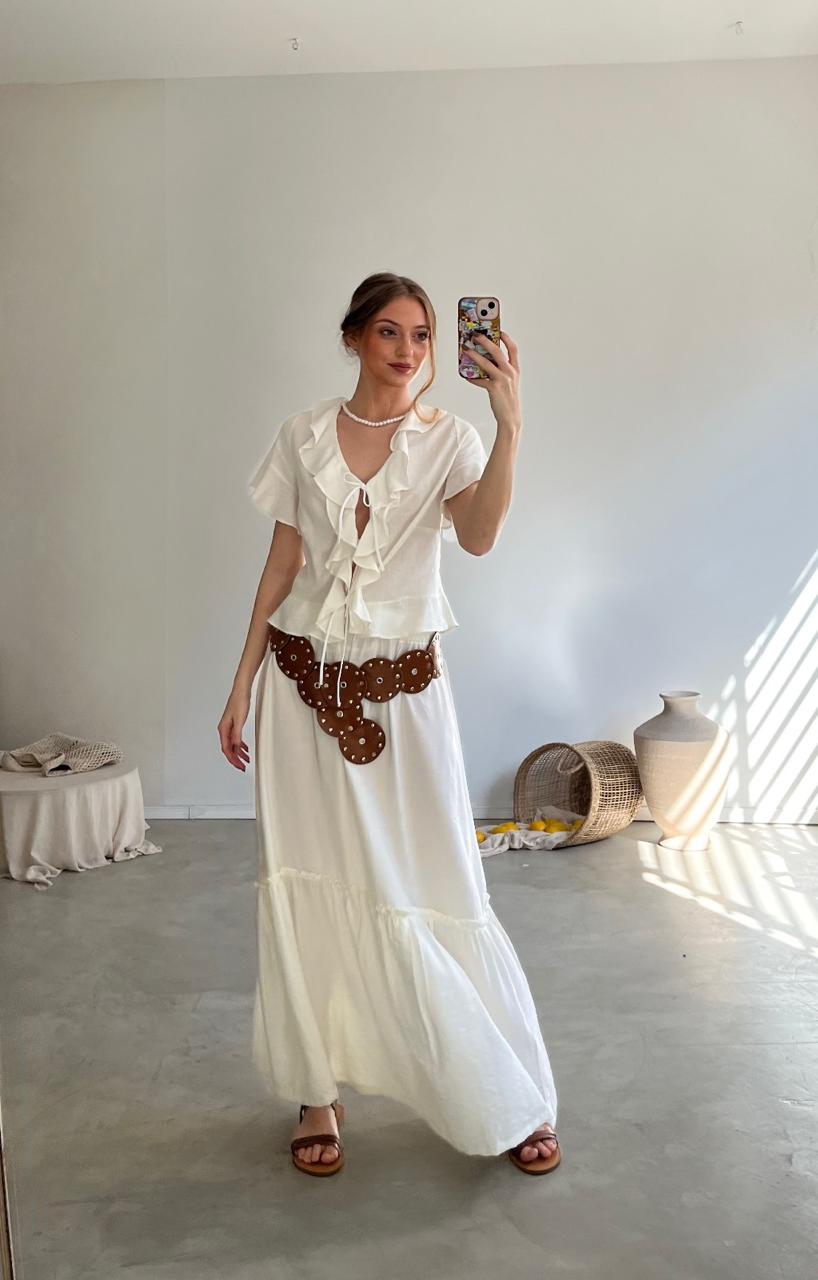 Descripción: blusa de cuello redondo. Detalle de volantes delantero de la misma tela. Detalle de cordón. Mangas largas.