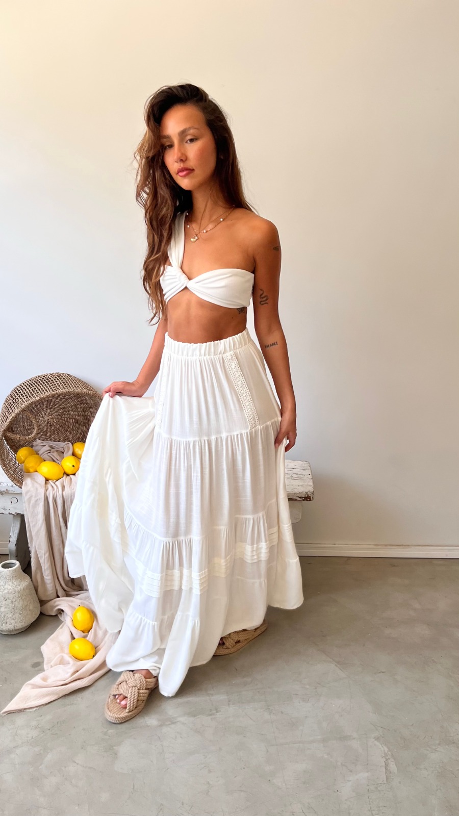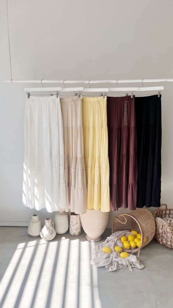 Descripción: Maxifalda con elástico en cintura. Detalle de puntilla en delanteros. Bajo acabados en volados.