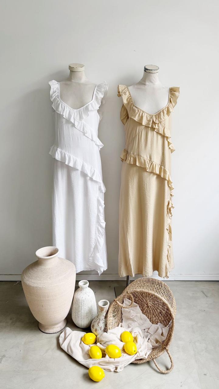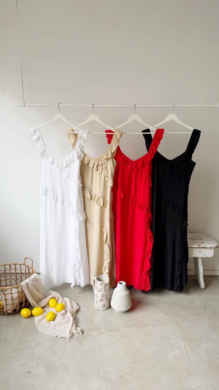 Descripción: vestido midi con tiras en el cuello (no ajustables) detalle de aplicación metálica en delantero. Tajo trasero.
